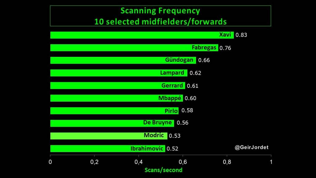 Un aspetto non eccessivamente considerato e che i più attenti avranno notato soprattutto in Reijnders è quello riguardante lo scanning. Cioè il guardare a testa alta scansionando gli spazi e la posizione dei compagni in modo continuo. Sono stati analizzati alcuni giocatori negli ultimi 20 anni inclusi i ruoli come vedete nell’immagine. Questa è riferita a quante volte con lo sguardo e i movimenti della testa controllavano lo spazio nei 10 secondi prima di ricevere la palla. I centrocampisti come previsto lo fanno mediamente più degli altri e Xavi è stato uno di quelli che più lo facevano.