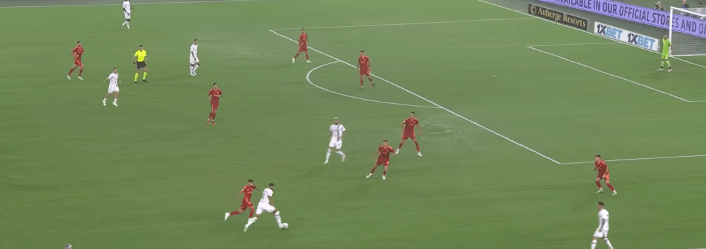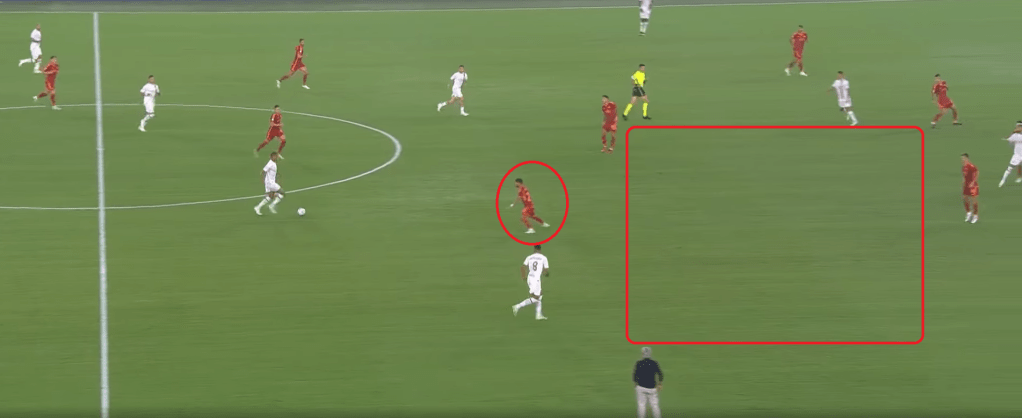 Lo scarico su Loftus libero è il primo presupposto che crea il pericolo. Perché si genera uno spazio alle spalle di Aouar. Mourinho di suo tiene sempre la linea di difesa abbastanza bassa per cui si crea spesso spazio tra la difesa e i centrocampisti. Questo è successo in modo più marcato dopo il vantaggio ma lo vediamo dopo.