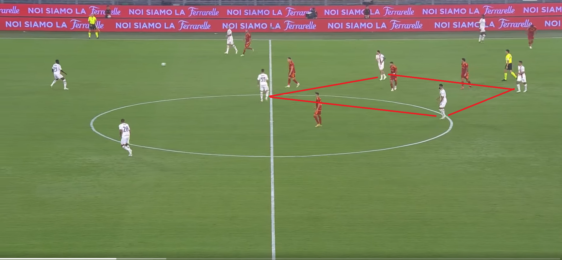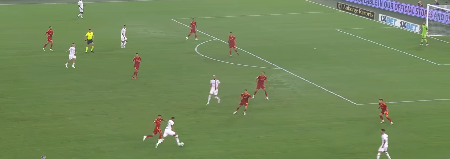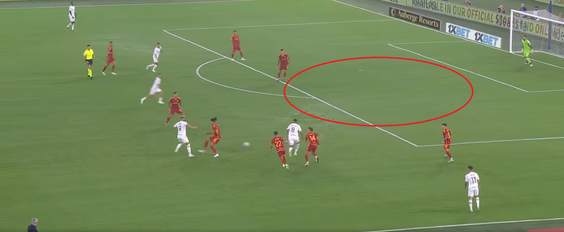 Lo scarico su Loftus libero è il primo presupposto che crea il pericolo. Perché si genera uno spazio alle spalle di Aouar. Mourinho di suo tiene sempre la linea di difesa abbastanza bassa per cui si crea spesso spazio tra la difesa e i centrocampisti. Questo è successo in modo più marcato dopo il vantaggio ma lo vediamo dopo.