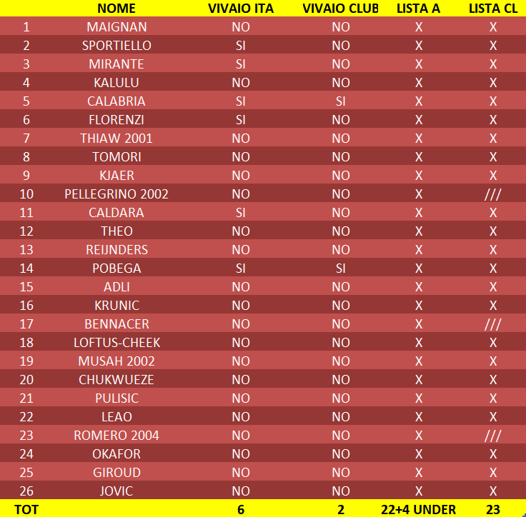 I giocatori da iscrivere in vista di gennaio sono 22. Se ci fosse necessità di inserire qualcuno (esempio vice Theo), potrebbe essere acquistato anche uno straniero, non per forza un vivaio Italia. Progettualmente avrebbe in ogni caso più senso acquistare un vivaio Italia (prossimo anno Thiaw andrà iscritto e occuperà uno slot).