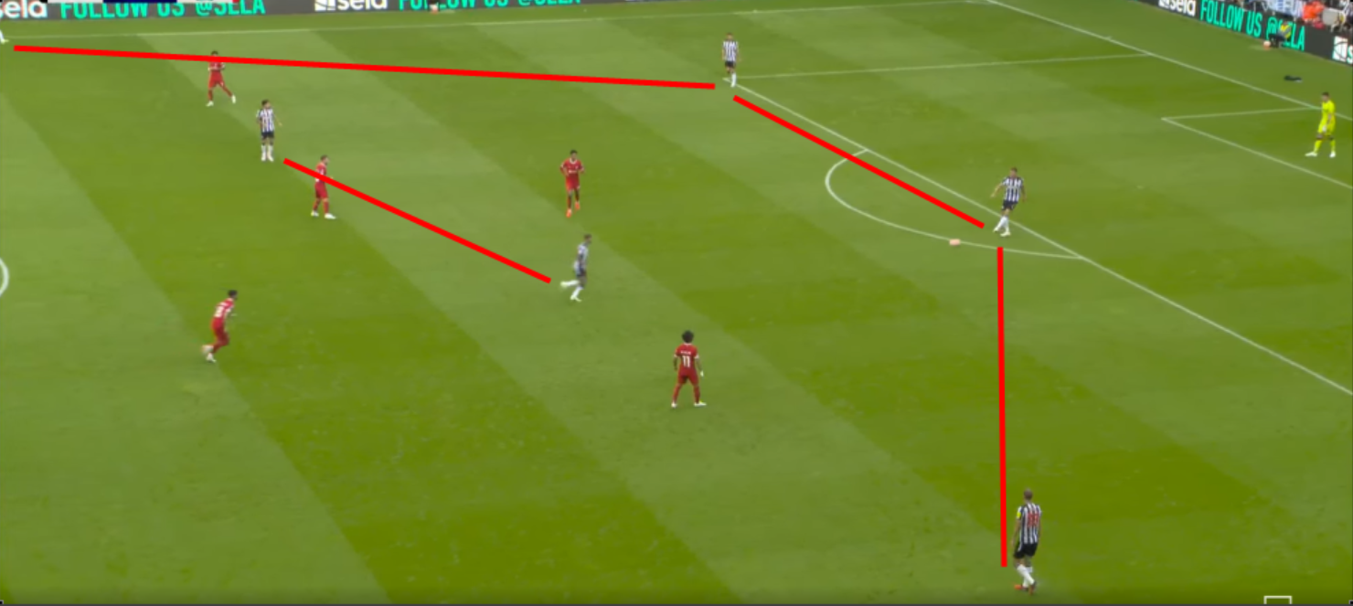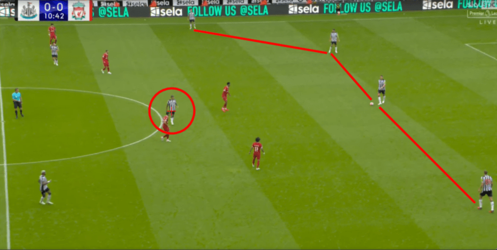 Il Newcastle è una squadra che usa principalmente come sistema di gioco un 433. Come caratteristiche non sono giocatori di palleggio, molto tecnici, ma è una squadra di gamba che gioca con tanta intensità. Una tipica squadra inglese. Generalmente se pressata forte tende a lanciare verso la punta e lavorare sulle seconde palle. Non è una squadra che cerca a tutti i costi la costruzione dal basso e il possesso palla. Molto spesso la costruzione dal portiere su rimessa dal fondo non avviene dal basso, ma si tende a lanciare lungo. Abbiamo preso in esame la gara col Liverpool che gioca un 433 per principi di gioco simile a noi. In caso di recupero palla e costruzione in gioco, il Newcastle ha costruito 4+1 di base come vediamo in questa immagine