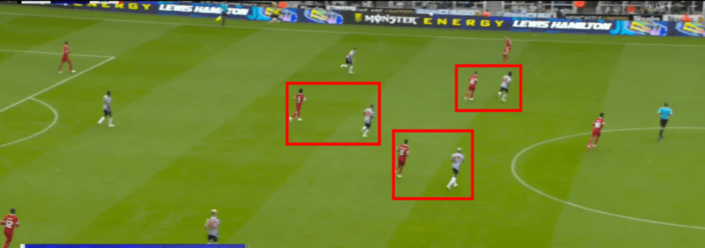 La lentezza dei difensori centrali e del terzino sinistro Burn, è un’arma da usare a favore da parte del Milan. Spesso la differenza di rapidità tra Burn e Salah, poteva creare problemi, ma non è stato bravo il Liverpool a sfruttarla a dovere. Mentre è stato molto bravo nelle 2 reti a imbeccare Nuñez nella profondità sfruttando appunto la differenza di velocità con i centrali come vediamo in questa immagine.