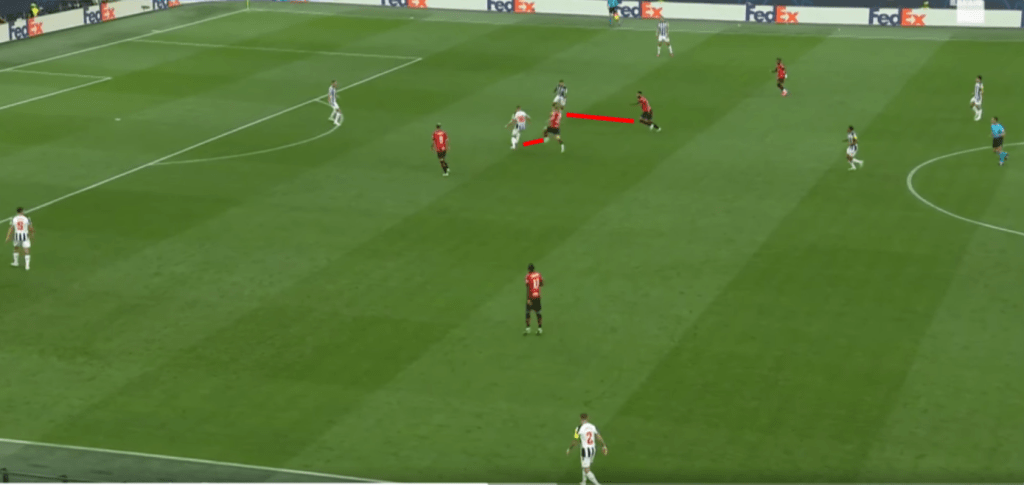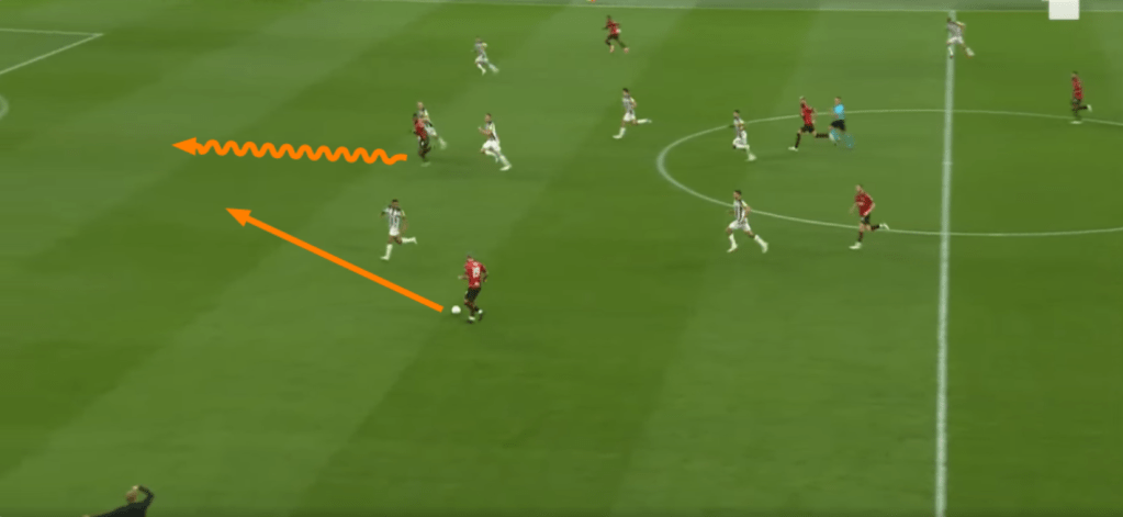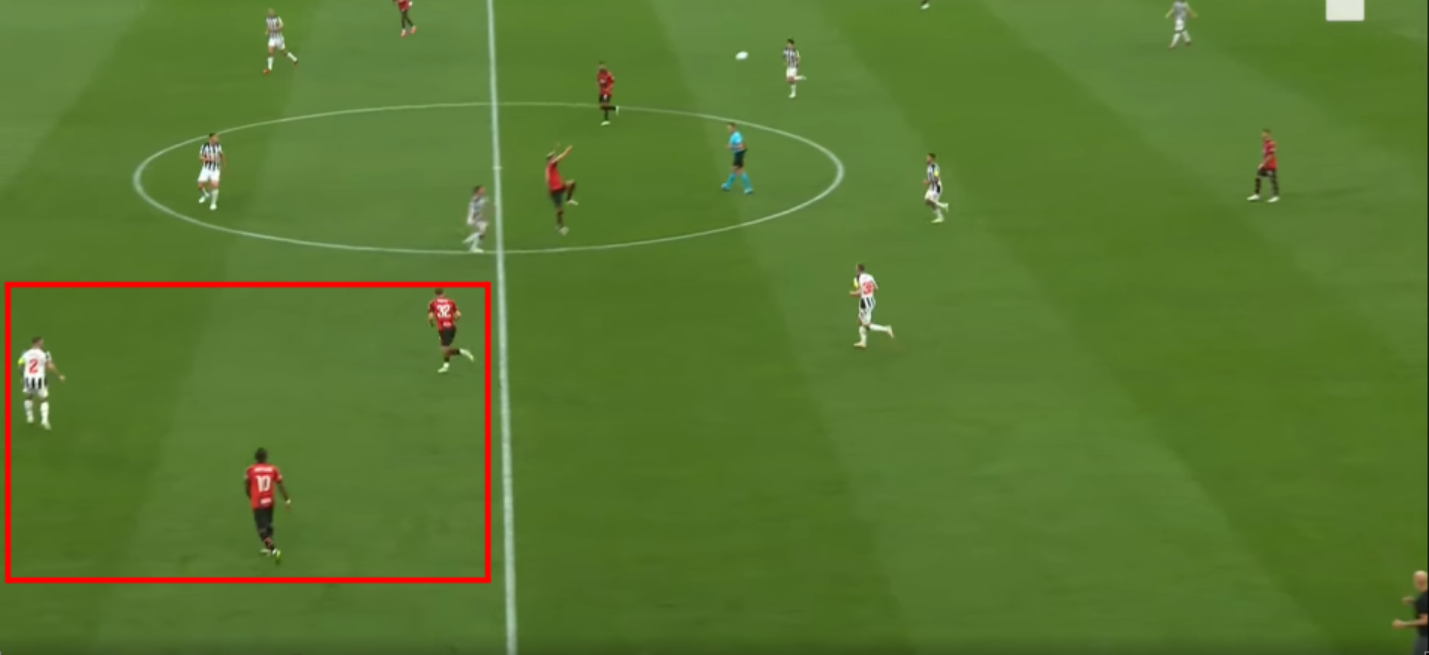 Altra situazione chiave nella gara è stato il duello Loftus contro Bruno Guimaraes. Il Milan mandava sempre Loftus su di lui, con Krunic e Pobega accoppiati sulle mezze ali. Nell’immagine si vede appunto Loftus su Bruno e Pobega che pressa la mezz’ala. Tonali in questo caso è rimasto più alto controllato da Krunic che non si vede nell’immagine. Il lavoro di Loftus è stato chiave nel soffocare la manovra del Newcastle che passava sempre per i piedi del brasiliano.