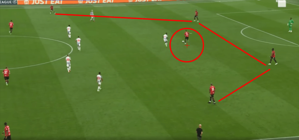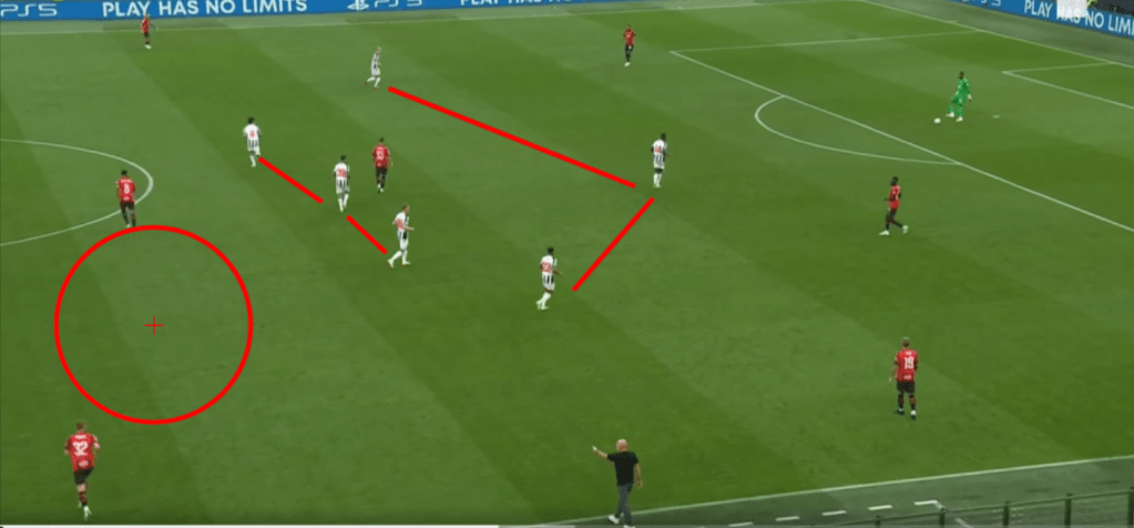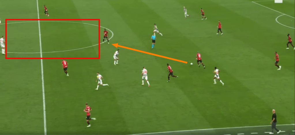 Il Newcastle andava in pressione ma non uomo su uomo, quindi scelta di Pioli che ha pagato, nei fatti si riusciva a trovare l’uscita o su Theo che spesso partiva con corse progressive spaccando la pressione, o con il lancio lungo che vedremo in seguito. Nell’immagine si nota come il Newcastle pressava senza andare uomo su uomo.