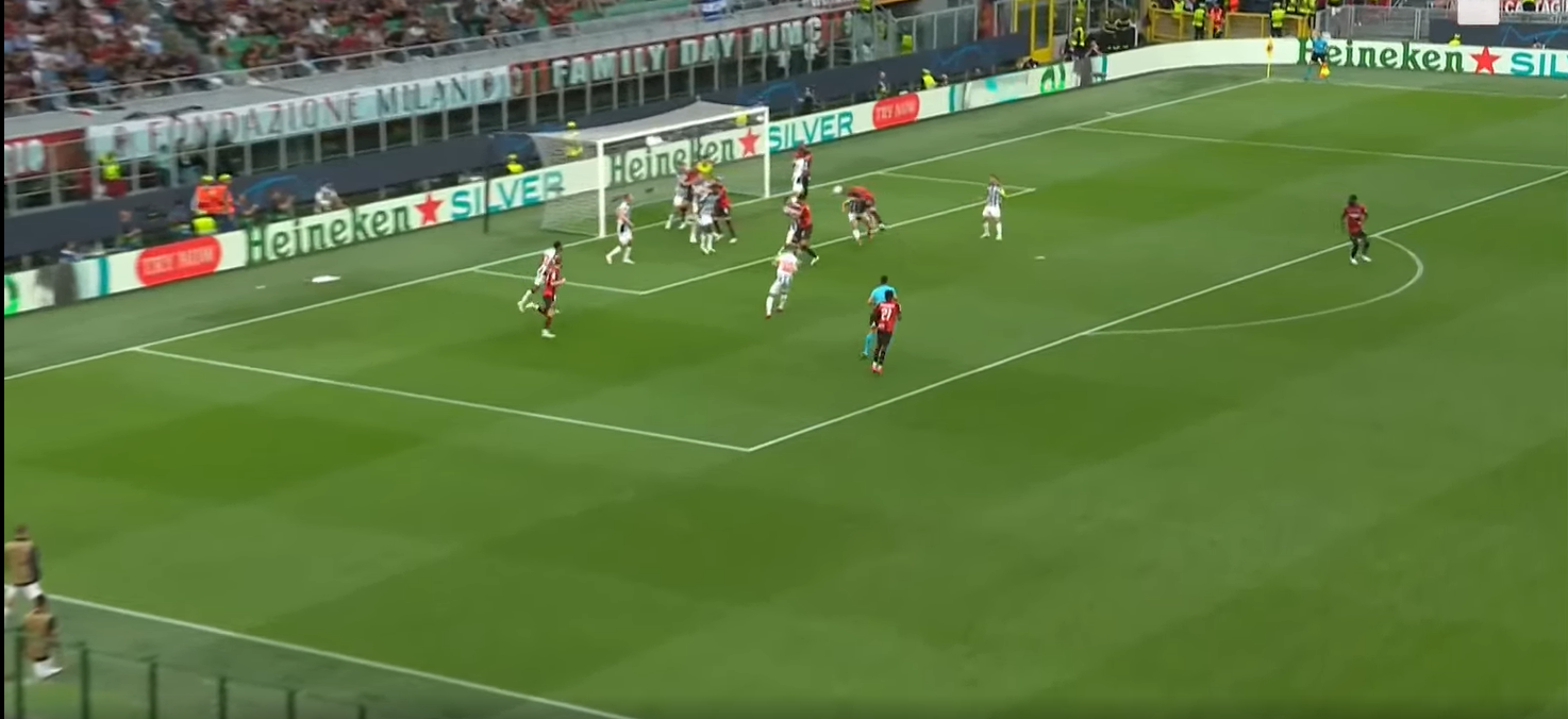 Il difensore come si nota è in ritardo nel duello aereo e Giroud può spizzare la palla sul lato di Leao/Pobega. In questa specifica azione sbaglia la spizzata e il Milan perde palla, ma con la spizzata giusta si sarebbe creato un 2 contro 1 molto pericoloso.