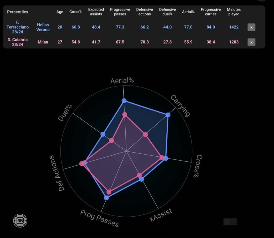 Nell’immagine abbiamo comparato lui a Calabria in questa stagione per avere un’idea visiva su quelli che sono i suoi numeri in questa stagione. Letteralmente ingloba Calabria in ogni stat. Oltretutto è italiano quindi va bene anche in ottica liste (anche se la UEFA le cambierà dopo sentenza della CGUE, ma non si sa come). Quindi è chiaro debba maturare un po’ in tutto, manca esperienza, manca la pressione di giocare in una big davanti a 75mila persone, manca anche nel completare il suo gioco, ma è un ragazzo che ha già caratteristiche per giocare con continuità OGGI al Milan e diventare a breve titolare.