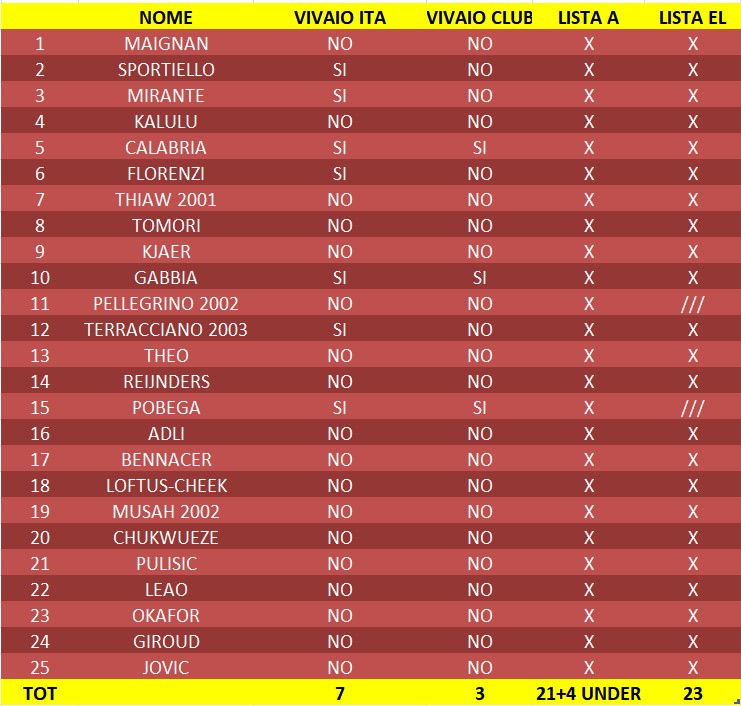 Con la partenza di Krunic e di Romero, con Pobega infortunato fino a fine stagione e con Thiaw, Tomori e Kalulu infortunati ancora per diverso tempo, Kjaer che dà poche garanzie fisiche, la cosa più logica che farà il club è inserire un nuovo difensore centrale e forse anche un centrocampista. E’ vero che Terracciano può fare la mezz’ala e Zeroli ormai è integrato in prima squadra, ma non è da escludere questa possibilità. Quel che è certo è che arriverà un difensore centrale. In lista Serie A ci sono 6 vivaio italiano, 3 vivaio club e 4 under quindi la lista è da 23. Terracciano viene considerato under. Gli altri under come Jimenez, Chaka ecc., non li abbiamo volutamente inseriti in lista per non appesantire troppo il discorso. Possono giocare in Serie A liberamente, mentre in EL dovranno essere da 2 anni almeno al Milan, quindi ad esempio Zeroli può giocare, Jimenez no a meno che non venga messo in lista, cosa pressochè impossibile.