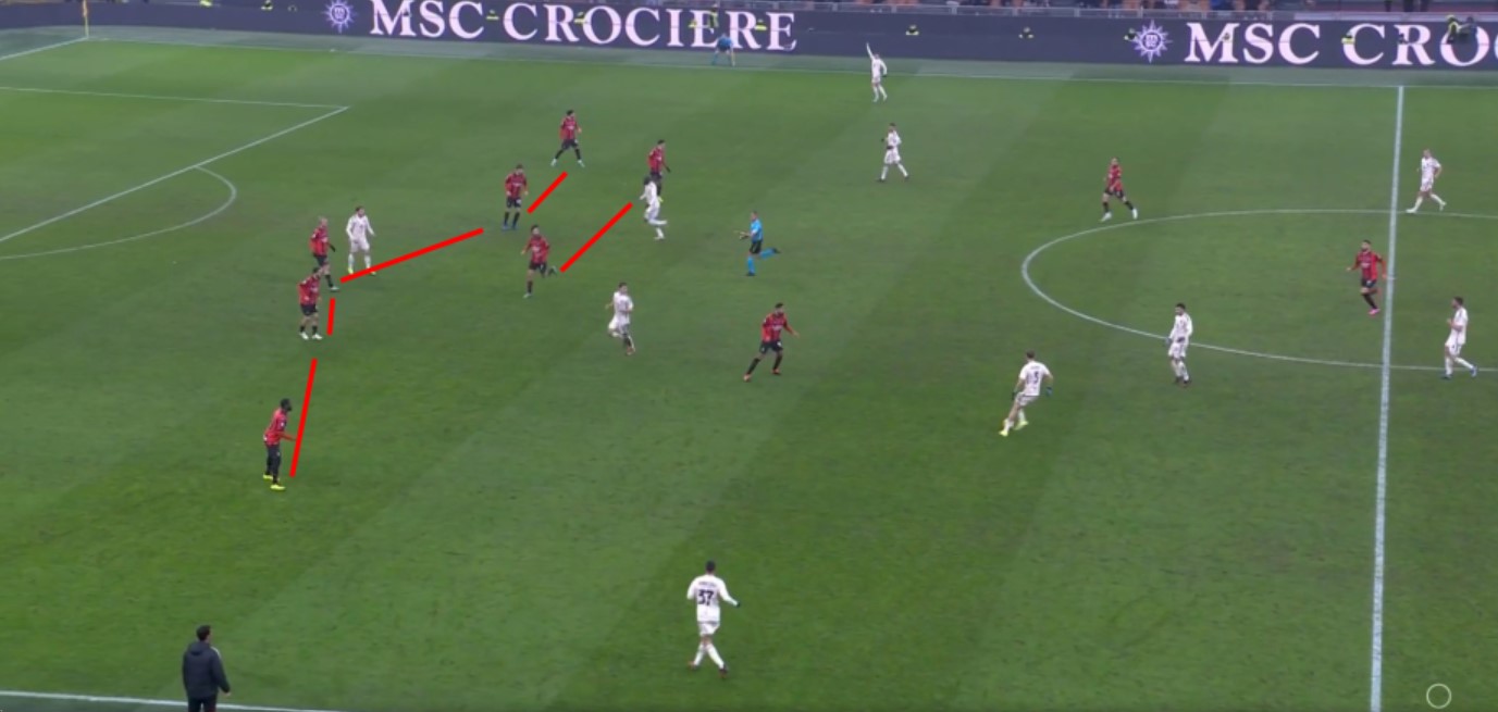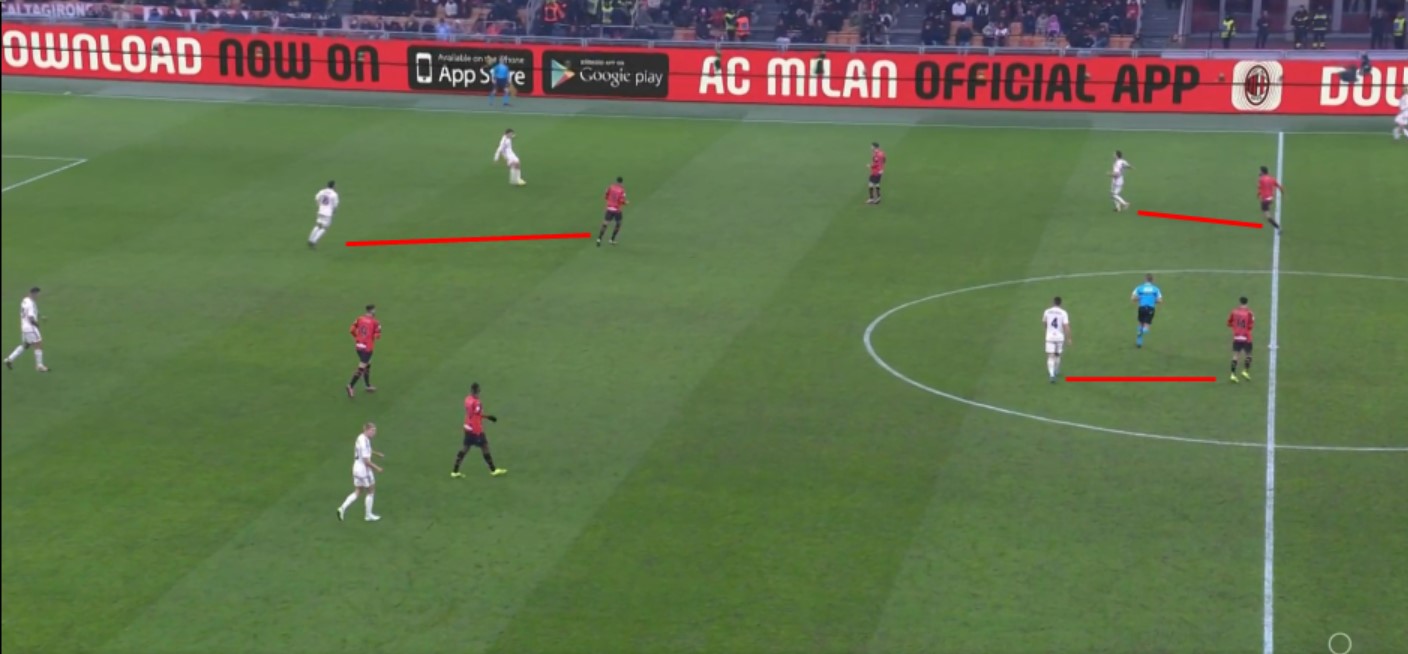 In fase difensiva invece non è stata fatta una linea di pressione altissima, anche perchè al momento la linea difensiva non ha giocatori veloci come Kalulu o Tomori, quindi è chiaro che un pressing ultraoffensivo non è consigliato. Pressing alto che veniva fatto però su rimessa dal fondo.