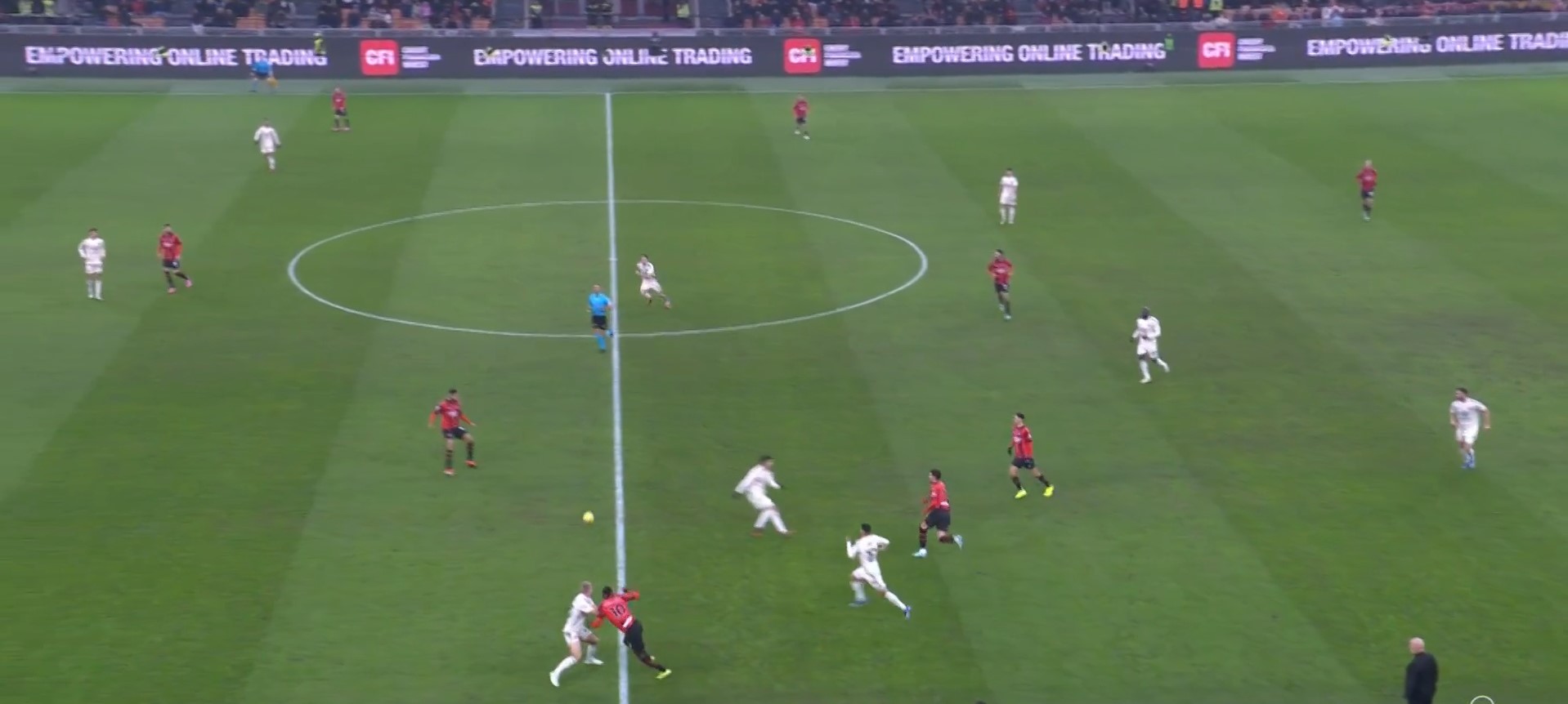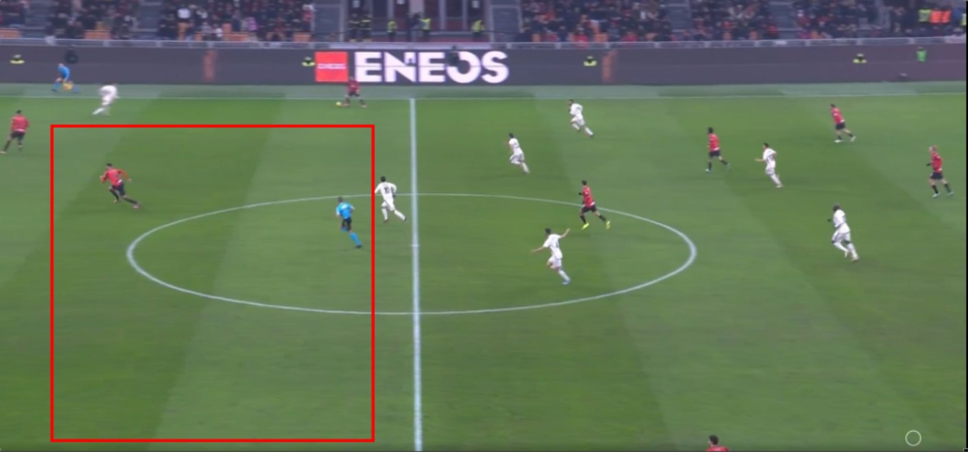 Anche nella seconda rete c’è un altro errore da parte della Roma. Il Milan batte rapidamente l’angolo e scambiano palla Adli e Leao.