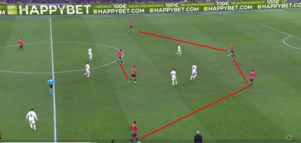 In questo caso specifico, avendo il terzo di difesa molto vicino alla mezz’ala, Pulisic può sostanzialmente occuparsi di entrambi, consentendo a Adli e Reijnders di scalare successivamente in marcatura.