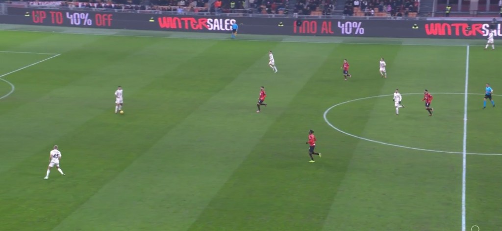 Anche in questa seconda immagine si nota come sulla costruzione della Roma, la linea di pressione del Milan non sia altissima.