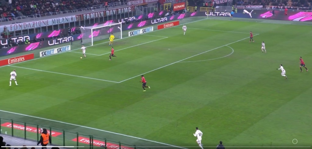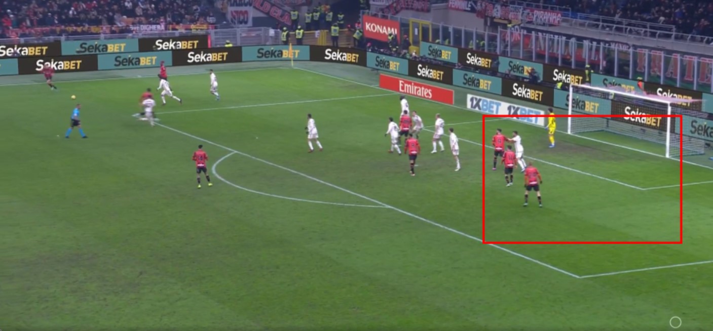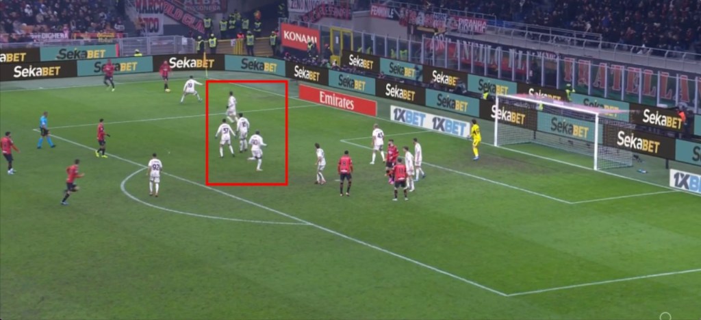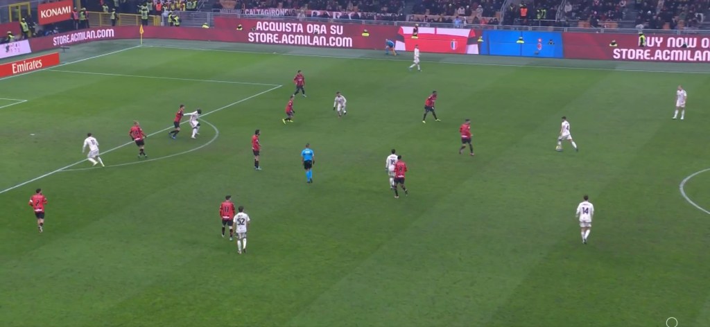 Nell’azione della prima rete si nota come anche in questo caso la fase difensiva della Roma sia rivedibile e il Milan approfitti della situazione.