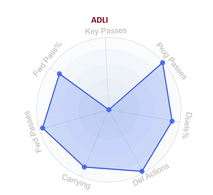 Ma la cosa che sorprende di più numericamente è il numero di azioni difensive con Adli che sta al 97mo percentile (ben più alta di Krunic, 64mo percentile), un numero altissimo, come risulta alta la percentuale di duelli vinti (89mo percentile), di poco inferiore a Krunic (93mo).