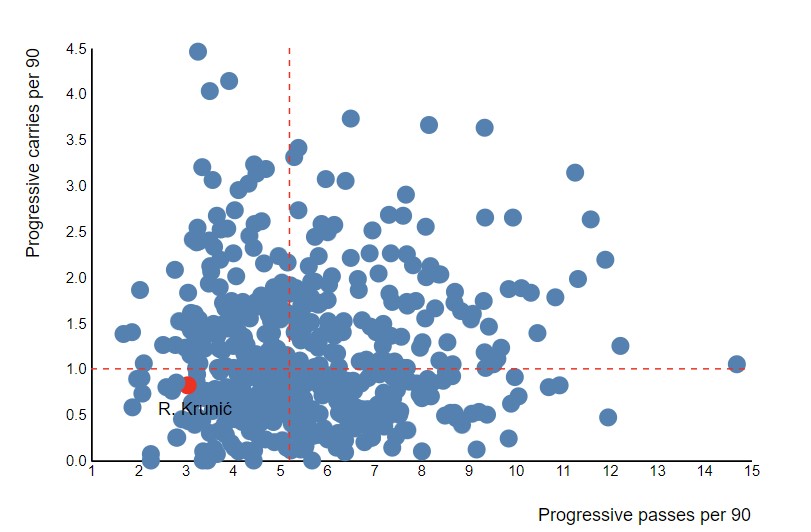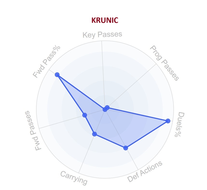 La capacità di Adli nel far guadagnare metri alla squadra con passaggi progressivi è, come si può vedere, tra le migliori a livello europeo ed è buono anche come corse progressive. Adli sta nel 99mo percentile come passaggi e 86mo come corse progressive rispetto ai centrocampisti top 7 leghe. Krunic sta nel 39mo percentile come corse e 4o come passaggi progressivi, cioè il 96% dei centrocampisti fa meglio di lui in quella voce. Con Adli stanno agli opposti.