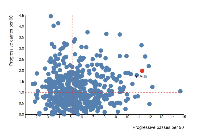 La prima cosa che balza all’occhio visivamente è la differenza tecnica tra i due giocatori. Adli è palesemente un giocatore qualitativamente superiore a Krunic e questo si riflette anche nei numeri. Si nota come Adli abbia una capacità nel far guadagnare metri alla squadra che Krunic non ha. Sia attraverso corse che passaggi progressivi. Possiamo notarlo anche nella tabella che li mette in relazione ai centrocampisti nei 7 maggiori campionati.