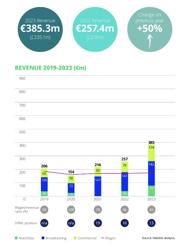 Come ogni anno, Deloitte fa un report chiamato Football Money League che analizza tutti i club economicamente. La prima cosa che si nota nel rapporto è come i primi 20 club europei nel 22/23 abbiano avuto un incremento notevole rispetto agli anni passati. Se questo è normale rispetto al periodo pandemia, fa riflettere la crescita rispetto al 2019. Infatti all’epoca erano stati generati ricavi per 9,2 miliardi dai top 20, mentre ora la cifra ha toccato i 10,5 miliardi complessivi. 1,9 miliardi vengono da ricavi dalle partite dopo la riapertura degli stadi a pieno regime post covid. Una domanda di biglietti crescente e un costo degli stessi aumentato da parte dei club, portano 13 dei primi 20 club ad avere incrementi considerevoli.