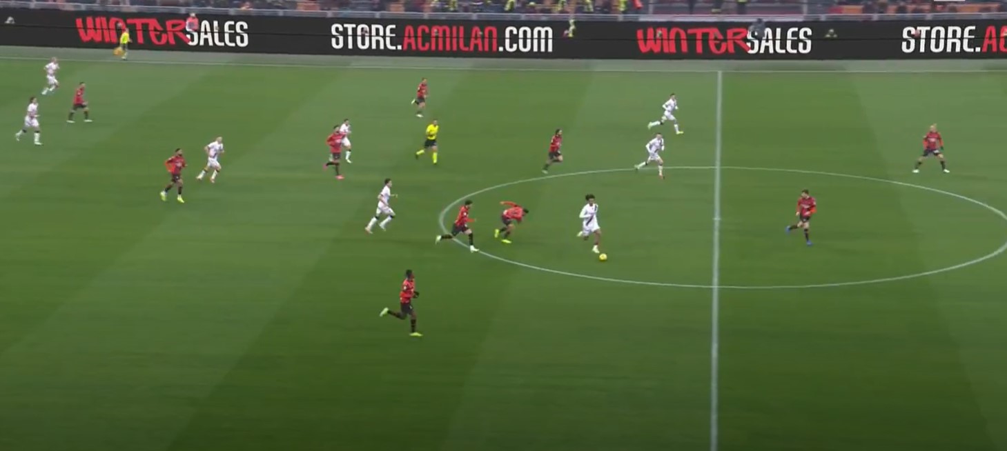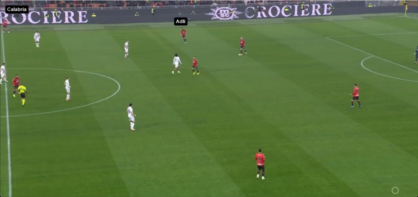 E’ stata una gara piacevole per gli spettatori, ma che ha evidenziato sia i problemi tattici, sia i lati su cui il Milan sta migliorando rispetto al periodo scorso. Non sarà un’analisi incentrata sulla partita in sé, ma più su alcune situazioni. Come spesso accade, stiamo vedendo iniziare la costruzione col doppio play, anche se in questa gara Adli più spesso andava ad abbassarsi al posto di Calabria, col terzino che andava fuori linea.