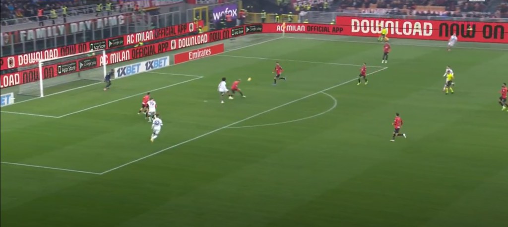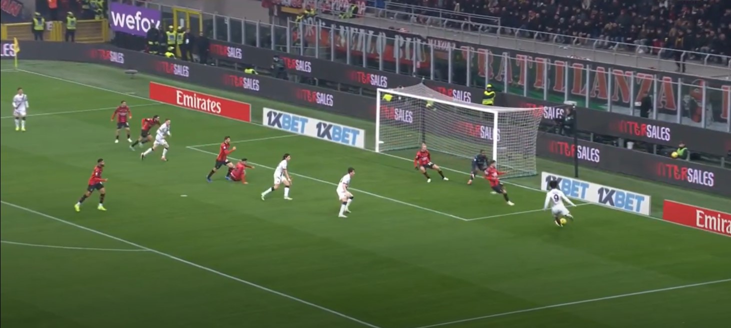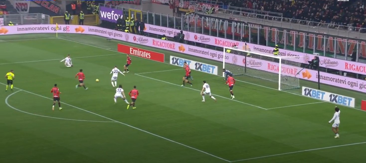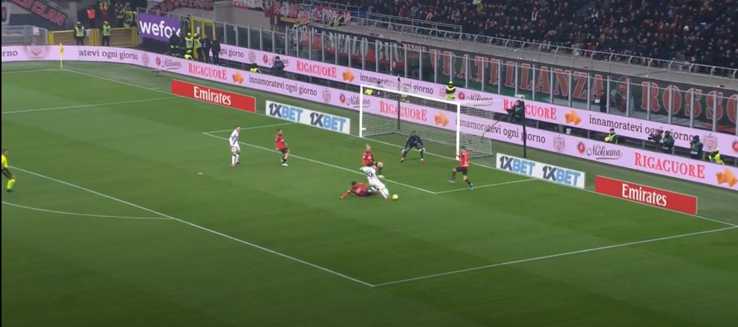 La casualità vuole che la palla vada a finire proprio verso Zirkzee che fa la scelta sbagliata, ma riesce a segnare. Quel tiro aveva solo il 5% di possibilità di diventare rete, mentre aveva due compagni messi in posizione migliore per calciare. La rete nasce non tanto dal fatto che in area il Milan abbia “ballato” e non sia stato perfetto, ma dal fatto che basta un lancio, un recupero palla per arrivare in porta in situazione di superiorità numerica.