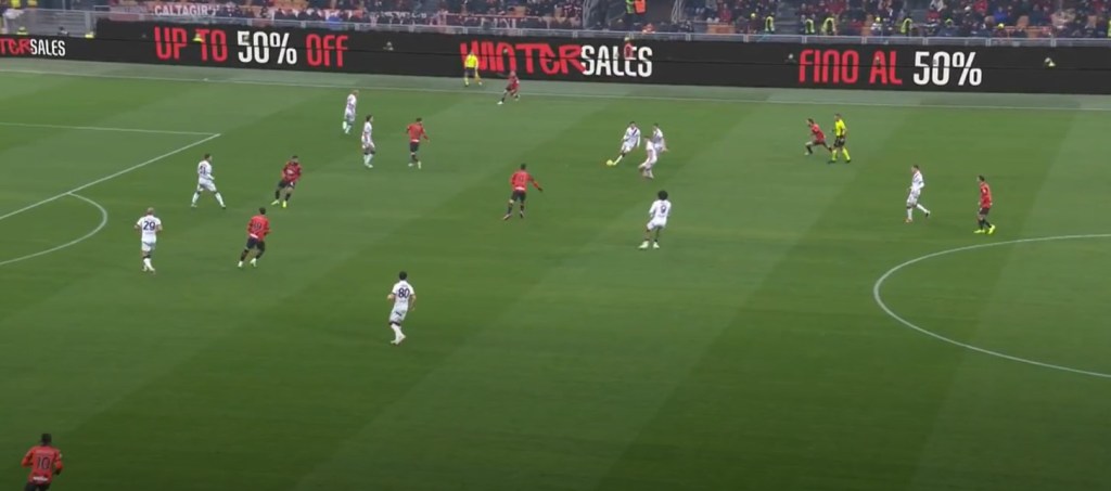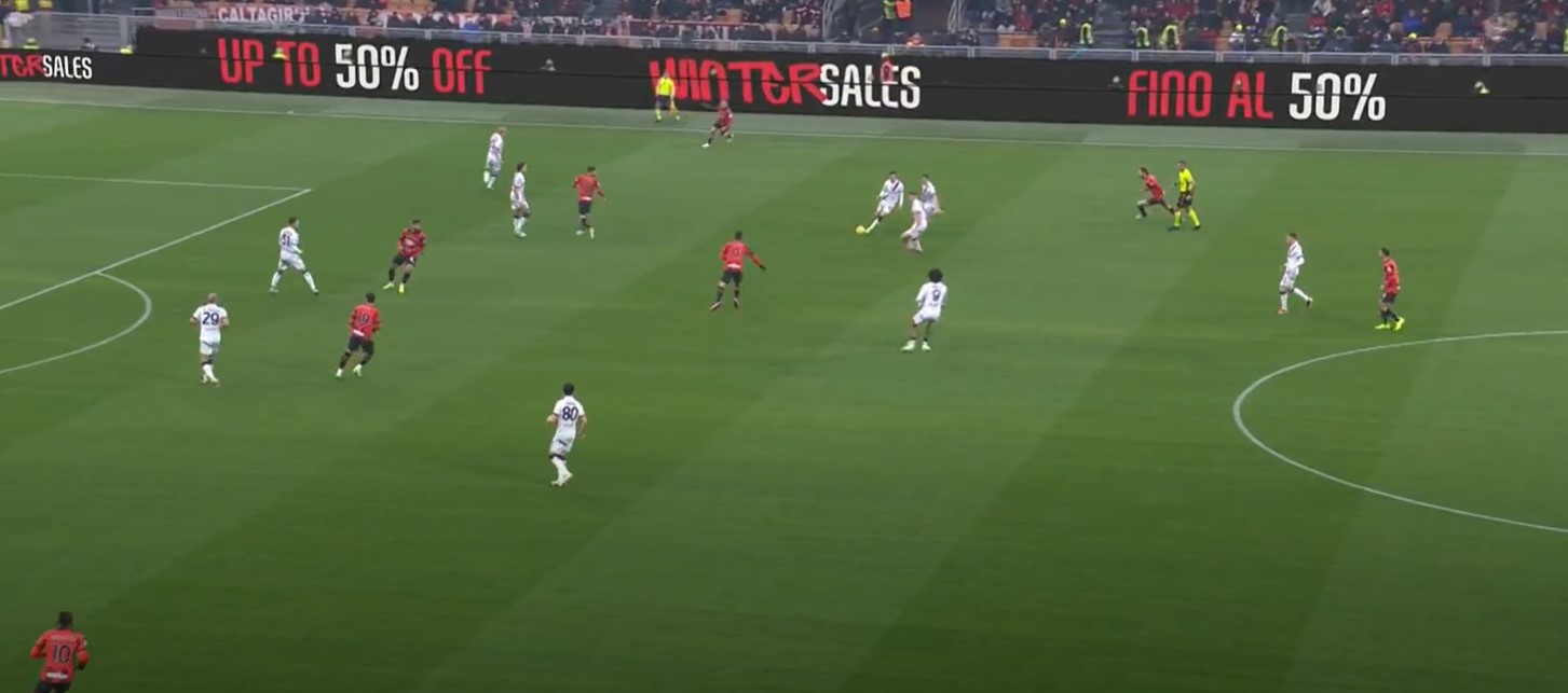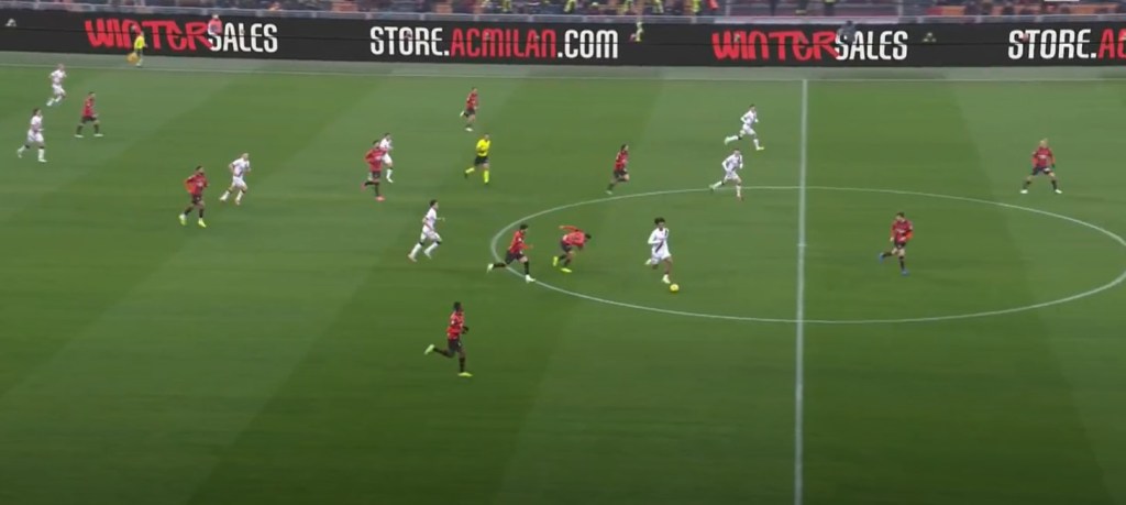 Adli in questo modo godeva di spazio per ricevere e la costruzione avveniva in modo abbastanza buono e pulito. Chiaramente col doppio play tecnico e una costruzione in gioco con 6 uomini, diventa abbastanza facile uscire dalle pressioni e sviluppare meglio l’azione, infatti vediamo un Milan che palleggia meglio e costruisce di più. Oltre al fatto che la condizione atletica è in crescita. Ma l’uso di Adli e Reijnders insieme è purtroppo un limite, come già analizzato in articoli passati e come ora vedremo.