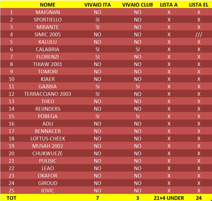 Con 7 cresciuti nel vivaio italiano e 3 nel vivaio del club, la lista è da 24. Simic sta al Milan da meno di 2 anni quindi non può andare in lista B. Lista B alla quale possono accedere ad esempio Zeroli e Bartesaghi.
