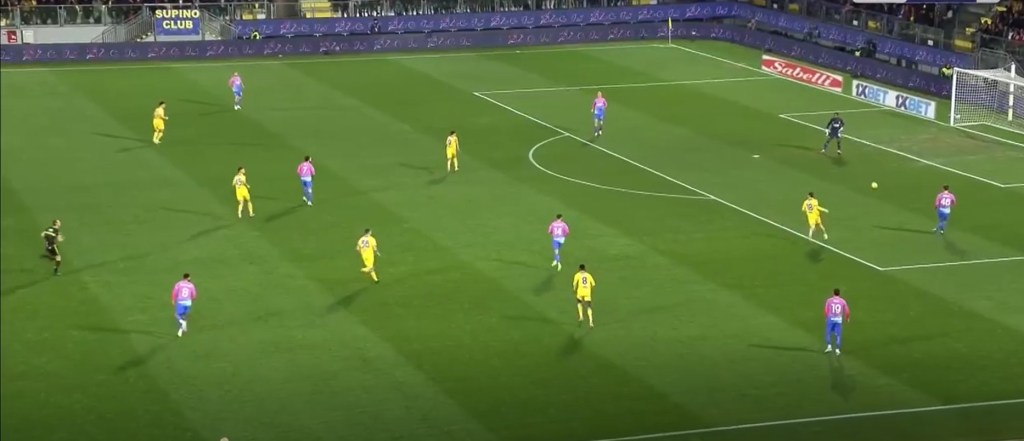 Adli ci prova ma non ha quelle caratteristiche quindi perde il duello, viene saltato e si genera un’occasione interessante per il Frosinone