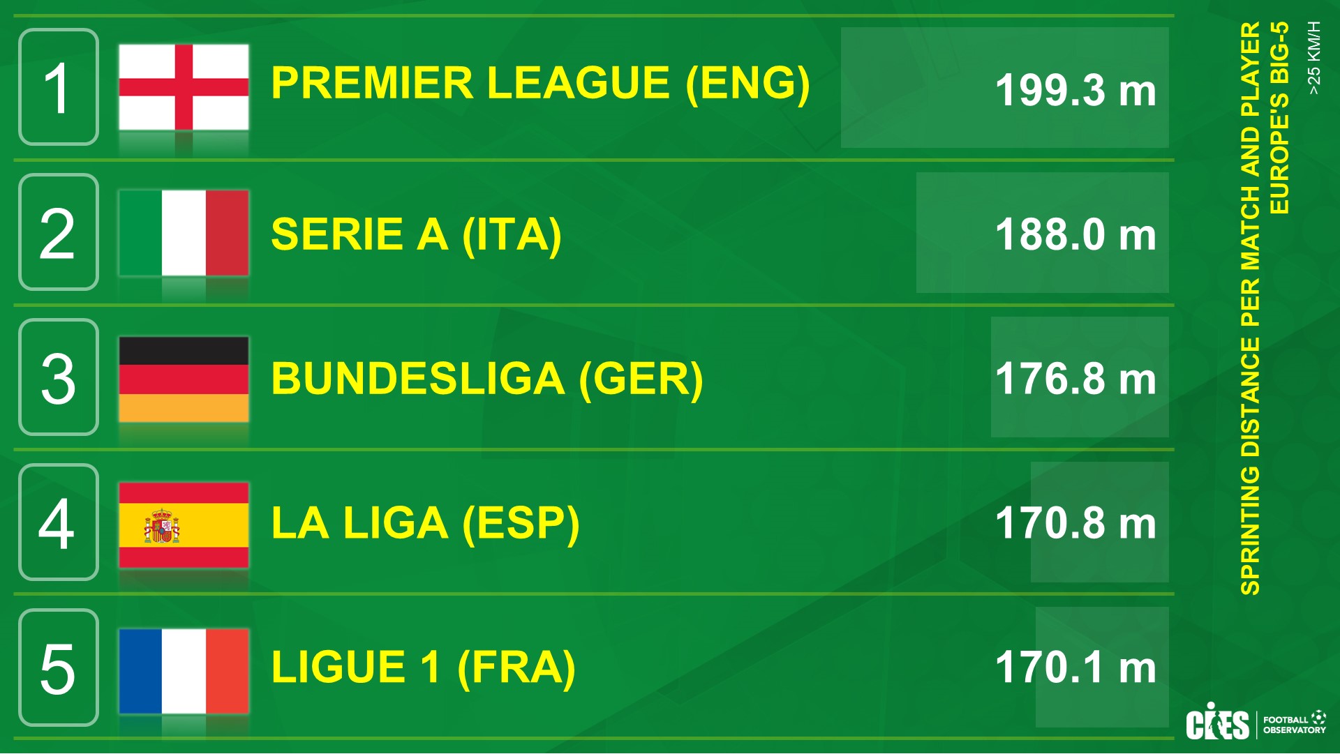 Secondo una ricerca effettuata da SkillCorner commissionata dal CIES, si può notare come la Serie A sia il secondo campionato nei top 5 come metri in sprint (velocità superiore a 25 Km/h) percorsi da ogni giocatore. In Inghilterra con quasi 200 metri a gara medi per ogni giocatore, sono primi in questa stat, ma l’Italia è nettamente seconda, ben staccata dagli altri campionati.