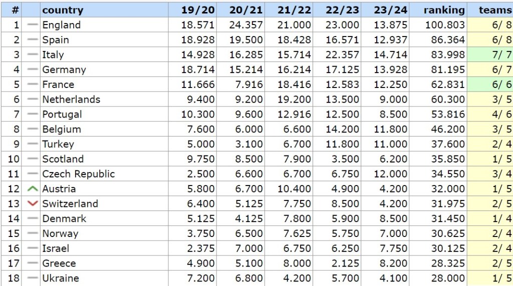 Il ranking annuale questa stagione è molto importante perché determina uno slot in più nella Champions per le nazioni che termineranno ai primi due posti. Come si vede dalla tabella, L’Italia con 14.714 è saldamente prima seguita da Germania con 13.928 poi Inghilterra con 13.875 e Spagna con 12.937