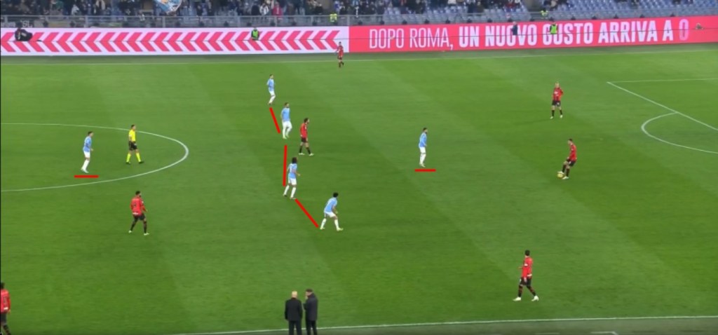 La Lazio è stata brava a creare problemi in costruzione al Milan, tenendo una linea di pressione media con una struttura 4-1-4-1, senza mai pressare alto e forte.