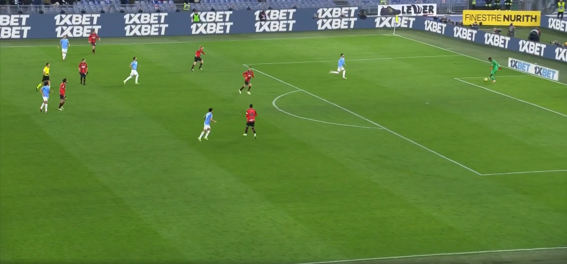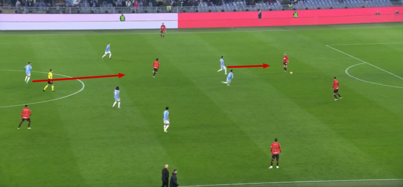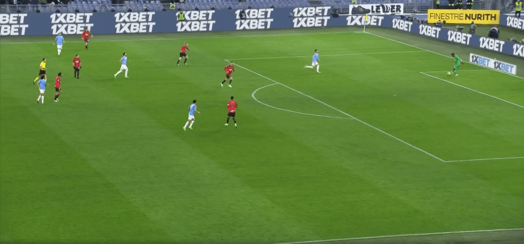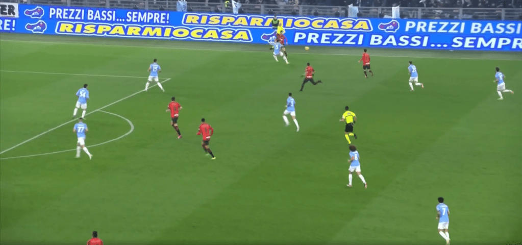 La Lazio dopo aver pressato in modo estemporaneo e sbagliato nei tempi, con poca organizzazione, scappa indietro ma si nota quanto spazio abbia Bennacer per ricevere.