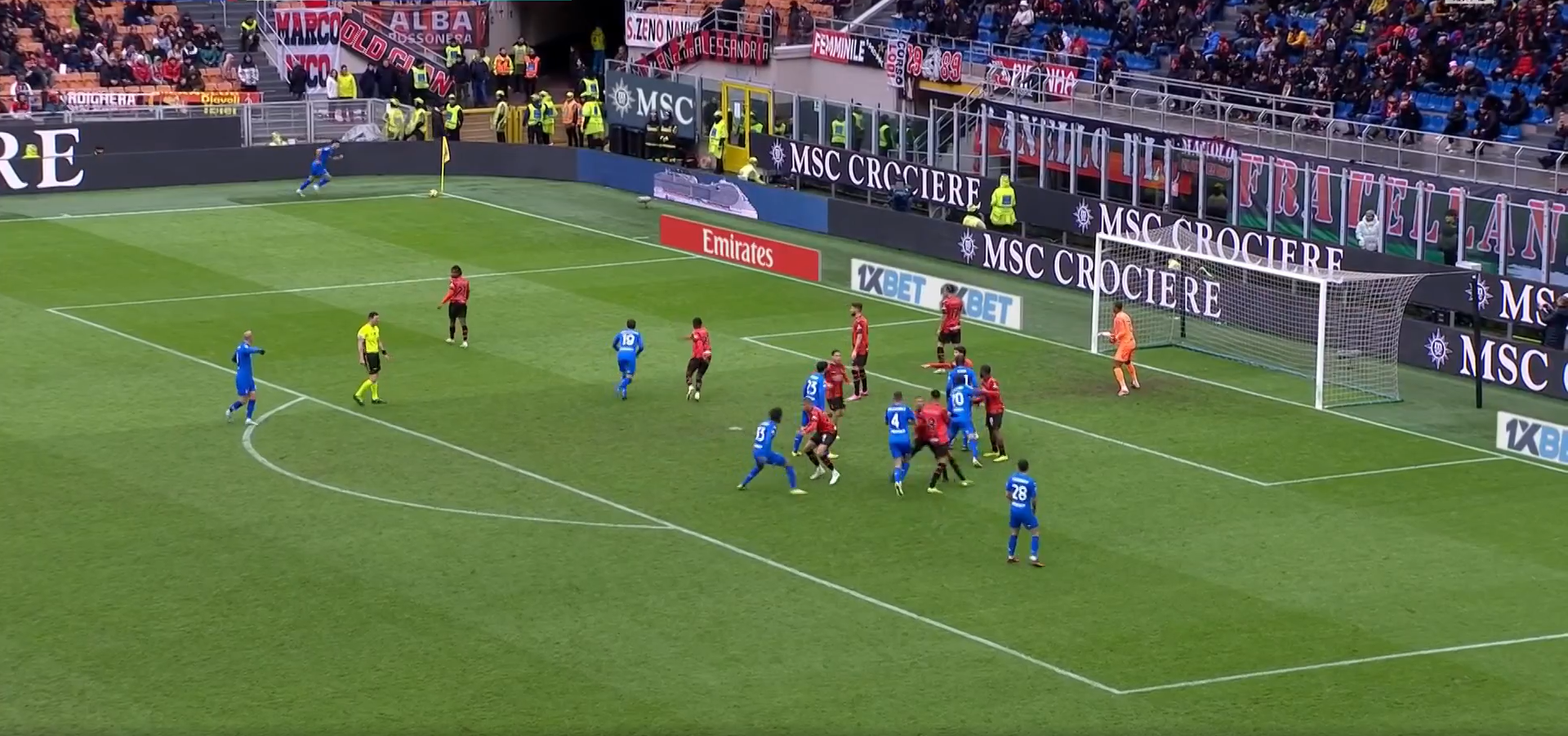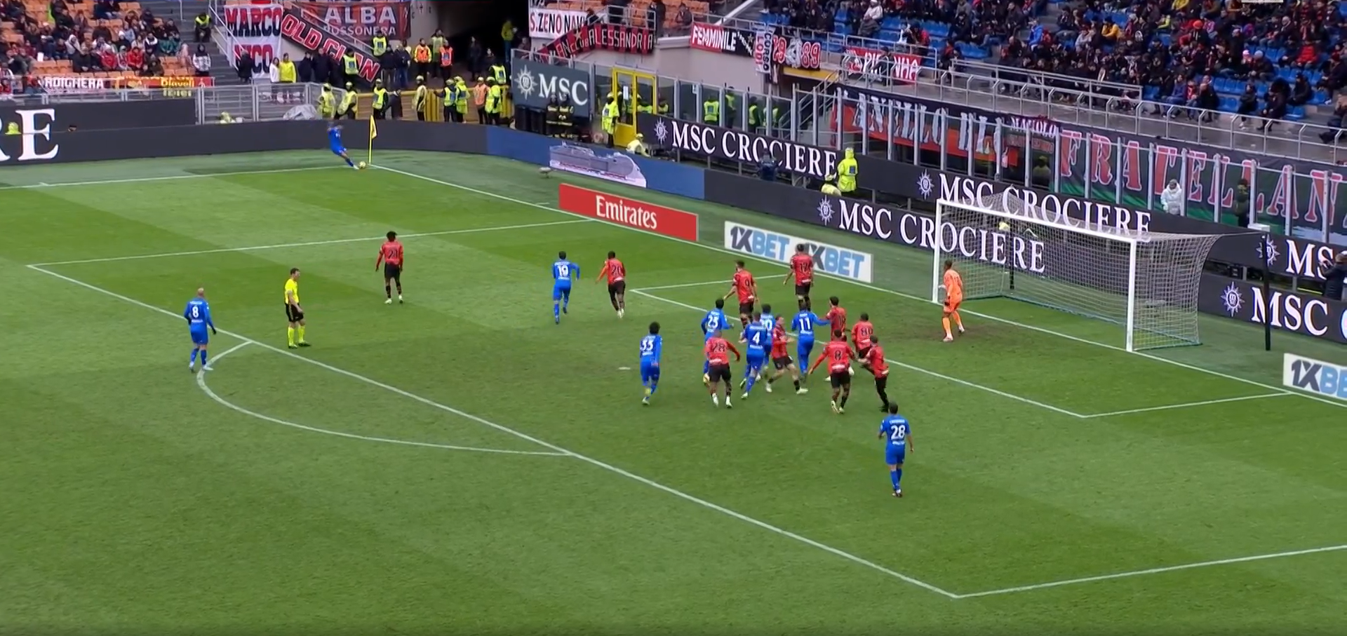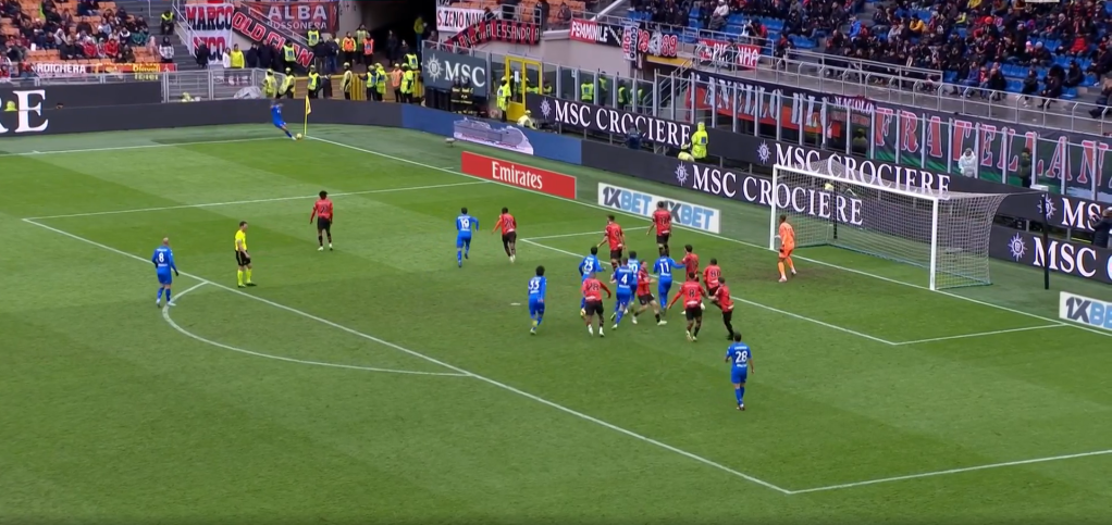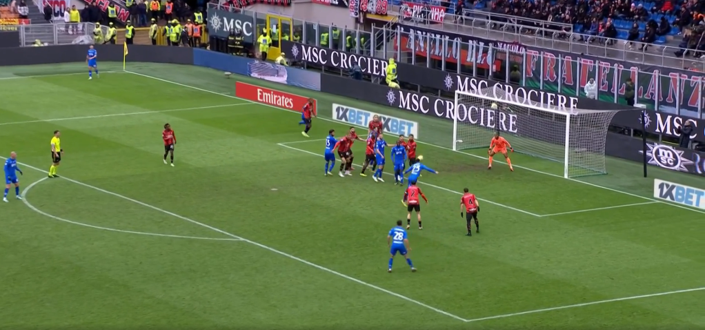 Prima della battuta si vedono 3 giocatori a zona, uno sul palo, uno in mezzo e uno a presidiare la zona più verso il limite dell’area. Gli altri sono accoppiati a uomo, tranne Calabria che non si capisce razionalmente perché passa accanto a Destro e nemmeno guarda cosa sta succedendo, corre senza nemmeno rendersi conto che l’angolo sta per essere calciato.