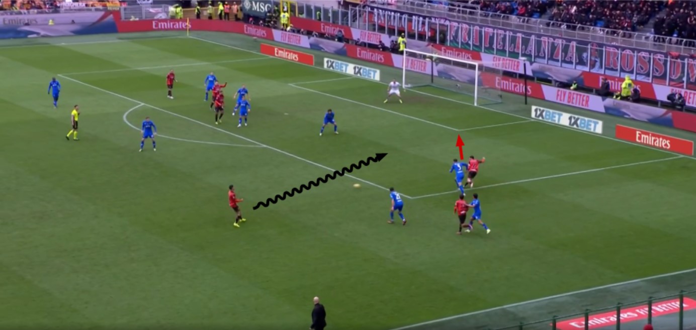 C’è un errore concettuale da parte del giocatore dell’Empoli che a palla scoperta corre in avanti anziché come i compagni fare una corsa indietro. La posizione di Okafor larga apre uno spazio tra i due ed è molto bravo Bennacer a imbucare in quello spazio, trovando Okafor che poi è molto bravo a dare la palla per Pulisic che segna.