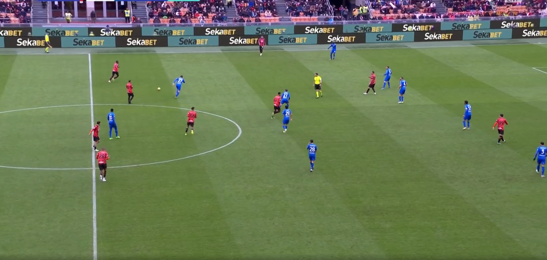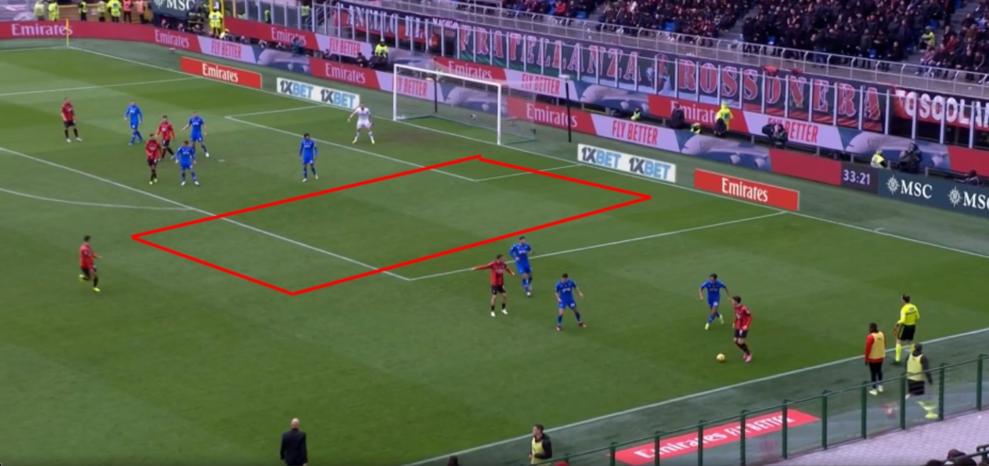 Vedendo l’immagine sopra, potrebbe sembrare un Empoli 5-4-1, in realtà c’era fluidità da parte di Gyasi che seguiva a uomo Theo. E chiaramente sia Zurkowski che Cambiaghi a seconda di dove il Milan andava a spostare la palla, uscivano quasi affiancandosi a Niang, spesso assumendo una struttura 4-4-2 o 4-5-1. Quello che non variava mai di principio era il cercare di non concedere vie centrali al Milan.