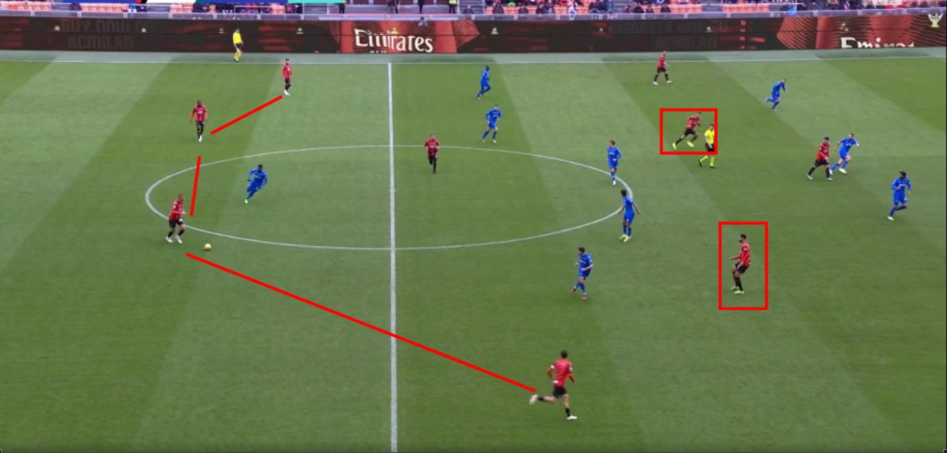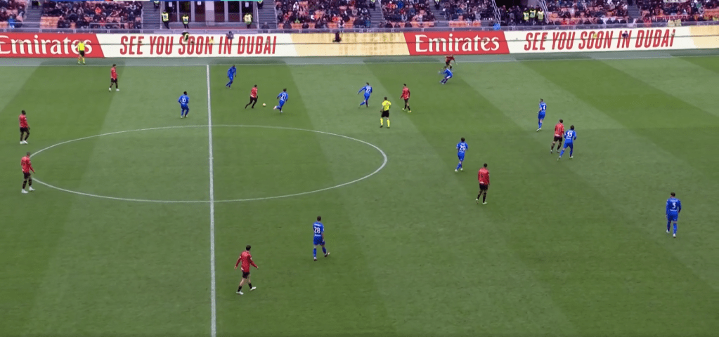 Gioco a due tra Calabria e Pulisic, terzo di difesa attratto fuori e corridoio generato. Reijnders poteva sfruttarlo buttandosi dentro e ricevendo da Pulisic che ha la qualità per servirlo. In questo caso riceve palla ed è lui stesso a imbucare su Calabria, bravo a leggere lo spazio e attaccarlo. Azione potenzialmente molto buona, ma situazione creata ben poche volte. Si poteva sfruttare di più e meglio.
