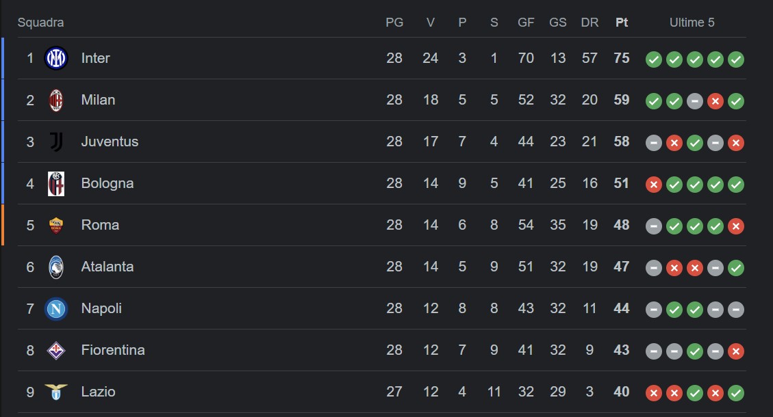 Con 16.571 comanda il ranking, seguita da Germania a 15.500 poi Inghilterra con 14.625 e Francia a 14.416. Da notare la Spagna quinta con 13.437 e solo 4 squadre rimaste, mentre l’Italia ha ottime possibilità di passaggio del turno per quasi tutte le 6 rimaste con conseguente aumento del gap rispetto alle altre nazioni. Quindi una possibilità davvero alta di terminare prima o seconda su ranking annuale (e seconda anche in quello generale). Questo significa che anche la quinta in campionato entrerebbe in Champions. Ed è ancora più complesso che Atalanta, Roma e Bologna viaggino tutte a oltre 2 punti di media e il Milan a 1 punto nelle ultime 10. Motivo per cui la stagione si sta incanalando, se il Milan sarà intelligente, verso la chiusura del discorso Champions nelle prossime 3 gare, per poi dedicarsi interamente solo all’Europa League. Il campionato diventerà irrilevante se non per la gloria, ma di certo non avrà senso disperdere energie dei titolarissimi in serie A con l’Inter avanti di 16 punti che ragionerà nello stesso modo dando ovviamente priorità alle gare in Champions da ora in poi, sarebbe stupido a non farlo.