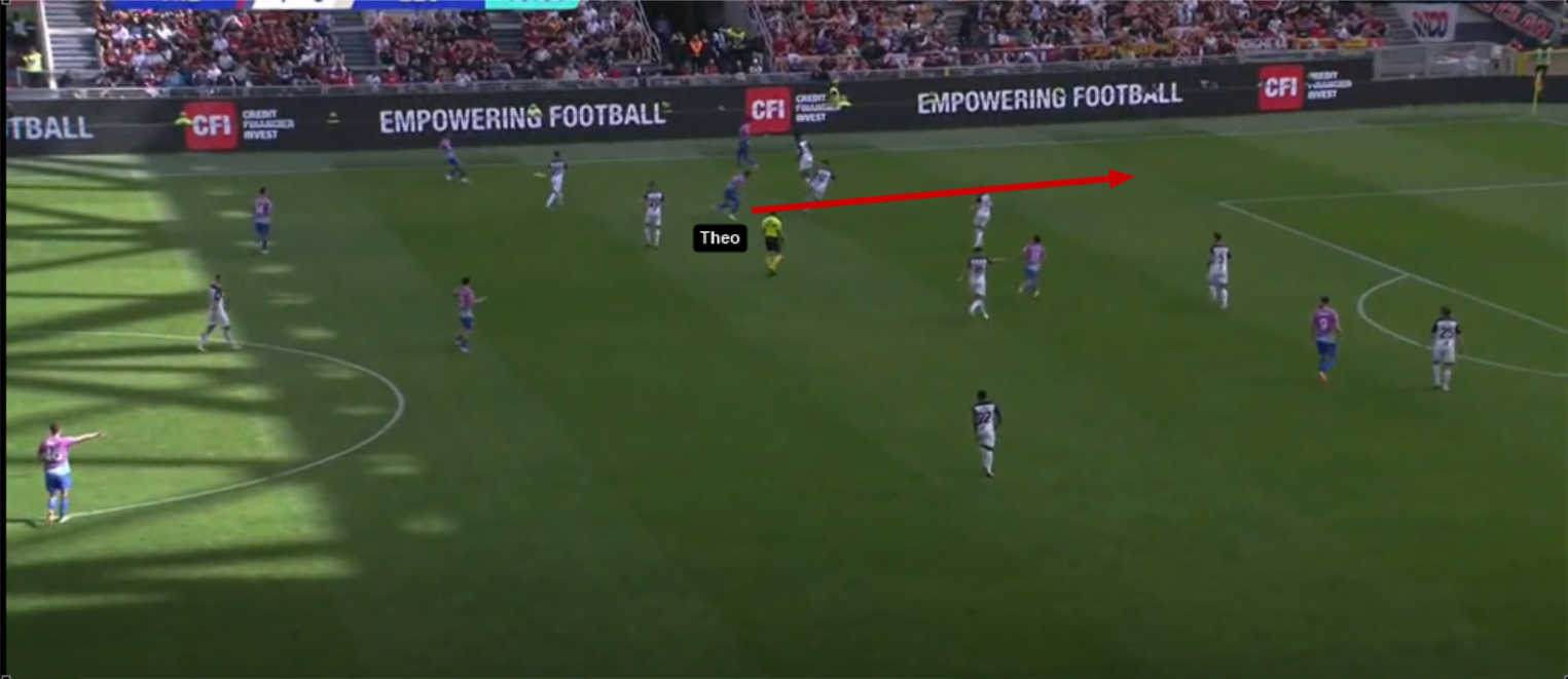 Un altro tipo di situazione che vorrei sottolineare è l’automatismo con cui lavorano Theo e Leao sulla catena di sinistra. Prendiamo ad esempio l’azione che porta all’angolo del 2-0.