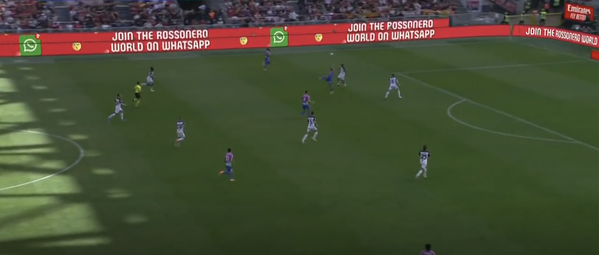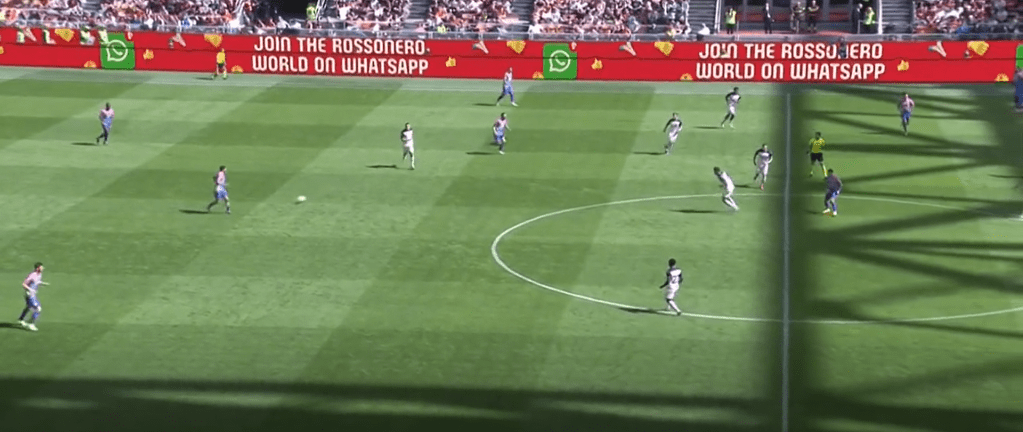 Si vede bene in questa immagine come Adli si abbassi in costruzione, in questo caso anche Reijnders si era abbassato ad aiutare, con Calabria e Theo entrambi dentro al campo. Leao dà l’ampiezza, idem Chukwueze dal lato opposto.
