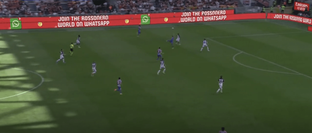 Viene lasciata ampia libertà di crossare e soprattutto Adli perde l’uomo sull’inserimento. Questione anche di caratteristiche, sappiamo come sia un giocatore più bravo con la palla tra i piedi che non difensivamente.