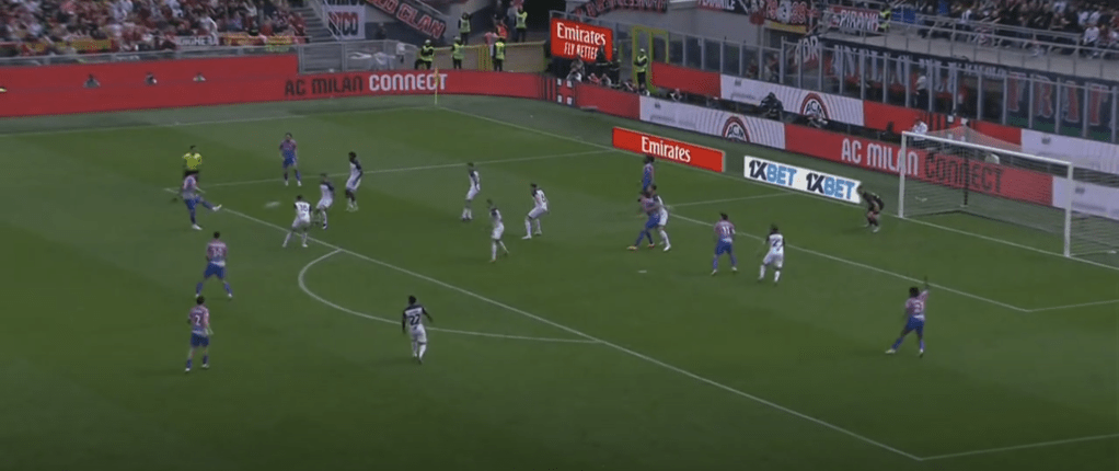Leao dopo l’azione personale è in fuorigioco, ma l’area è occupata bene. Colpisce Pulisic in mezzo, ma si poteva trovare Chuk libero sul secondo palo, così come si poteva dare palla a Reijnders per un tiro da fuori o lui stesso poteva poi trovare Chuk libero. Quando l’area viene occupata bene e con i tempi giusti, le soluzioni sono molteplici e si generano occasioni in quantità maggiore.