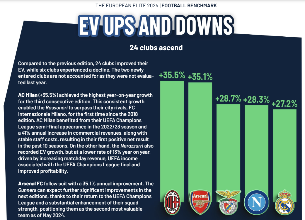Nell’analisi uscita oggi da parte di Football Benchmark, possiamo vedere come il Milan sia il club in assoluto che ha accresciuto maggiormente il proprio valore per il terzo anno consecutivo. Soprattutto l’incremento del marketing, la presenza costante in Champions con la semifinale dello scorso anno, rendono il Milan il club con la crescita annuale maggiore +35,5%