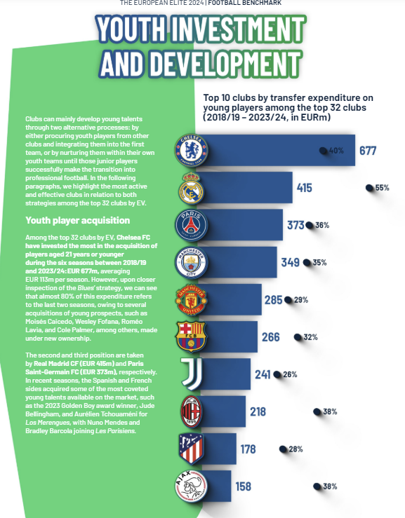 Il Milan in questo processo di crescita ha scelto di investire parecchio sui giovani. Nel report vediamo anche come sia tra i club che hanno investito maggiormente su giocatori di 21 anni o meno negli ultimi 5 anni.