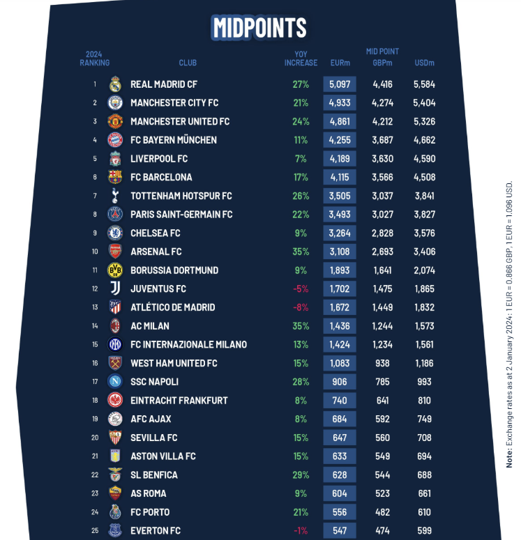 E’ uscito il report di Football Benchmark sui top club europei che analizza vari aspetti, tra cui il più importante è sicuramente la crescita/decrescita annuale del valore dei club. Avevamo nei mesi scorsi visto la crescita importante del Milan anche nel rapporto fatto da Deloitte (CLICCA QUI).