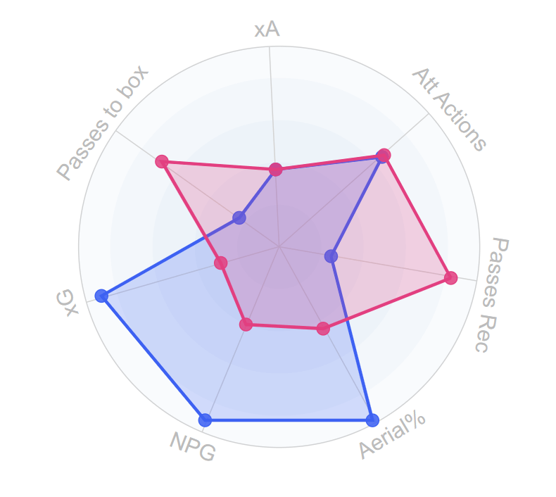 Zirkzee in rosso nel grafico (Morata blu), si vede come pur giocando da punta, generi pochissimi xG proprio perché ancora non ha minimamente i movimenti di attacco della profondità. Come dicevamo in una precedente analisi sull’olandese, la scommessa del Milan sarebbe dovuta essere quella di inserirgli quei movimenti e renderlo una punta completa. Non sarà mai un bomber che vive per il gol, così come non lo è Morata che ha altre caratteristiche oltre alle reti, ma la scommessa sarebbe stata quella di fare un investimento su un giovane già molto forte nel gioco di squadra e renderlo completo. Scommessa che poteva anche non andare in porto. Ha dimostrato di saper essere freddo nelle poche occasioni generate segnando 9 reti su azione con 7,4 xG, ma ha anche dimostrato che ad oggi non è una punta completa come si vede anche dal grafico. Per questo entro una determinata cifra poteva essere vista come un rischio percorribile, oltre no.