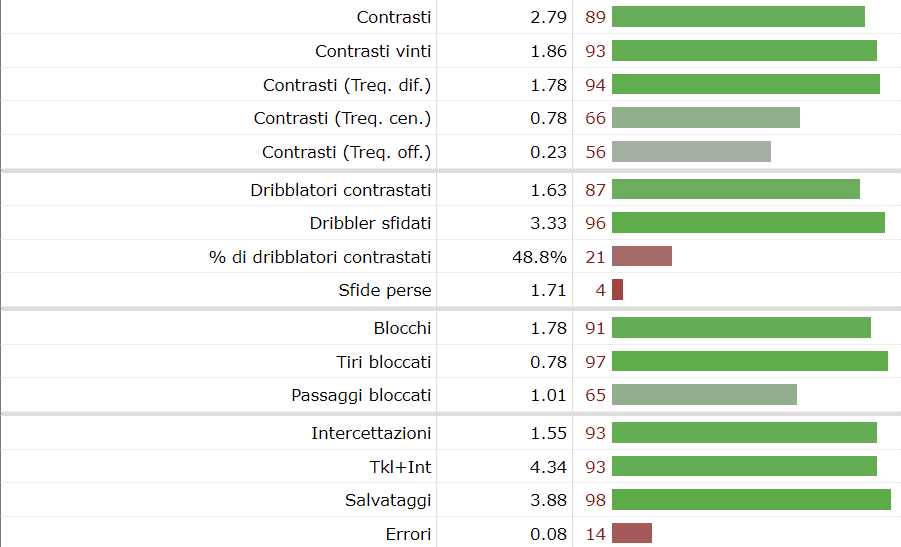 Come si può notare dall’immagine, la sua fase difensiva è quello in cui eccelle e al Milan serve un profilo che possa dare equilibri avendo un terzino sinistro di spinta e un gioco molto offensivo. Quindi va a prendere un “difensore” e questo è bene averlo chiaro da subito per non aspettarsi cose che non farà.