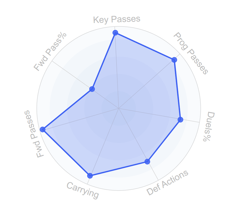 E’ un giocatore che sa garantire quella copertura nelle transizioni difensive, ma non è solo questo. E’ un centrocampista che fa meglio del 95% dei pari ruolo nel far progredire la palla in avanti. Questo suo cercare la profondità lo porta ad una % di completamento globale di passaggi non eccezionale che lo mettono nella media dei centrocampisti, ma proprio perché gioca principalmente in verticale e non con appoggi facili al compagno accanto. E’ più utile avere un mediano nel 90mo percentile di passaggi riusciti appoggiando palla al compagno accanto o è meglio averlo nel 40mo percentile ma perché va spesso in verticale? Dal momento che è tra i migliori mediani nel creare tiri e occasioni per i compagni, la risposta alla domanda è abbastanza scontata.