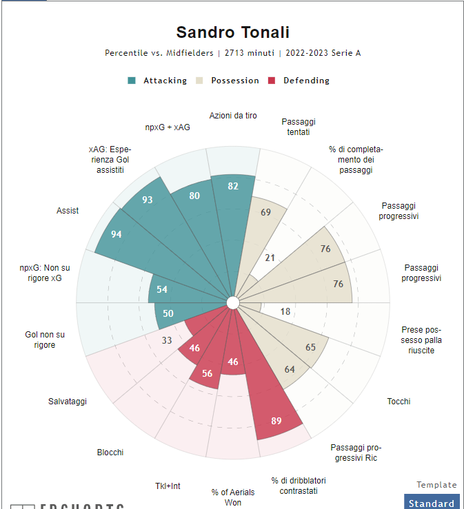 Dando un primo sguardo si vede come tra le 3 macroaree di valutazione, quella difensiva sia addirittura quella con i dati peggiori. Paragoniamo a Kessie l’anno dello scudetto e a Tonali l’ultimo anno in maglia Milan.