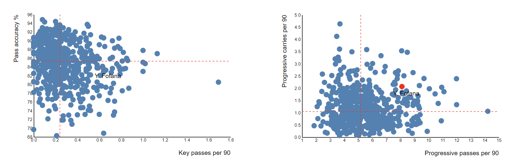 Anche vedendo in questi grafici, si nota immediatamente come Fofana sia un giocatore tra i migliori in Europa per corse e passaggi progressivi, quindi grande capacità di ribaltare il fronte. E come sia tra i migliori anche come passaggi chiave.
