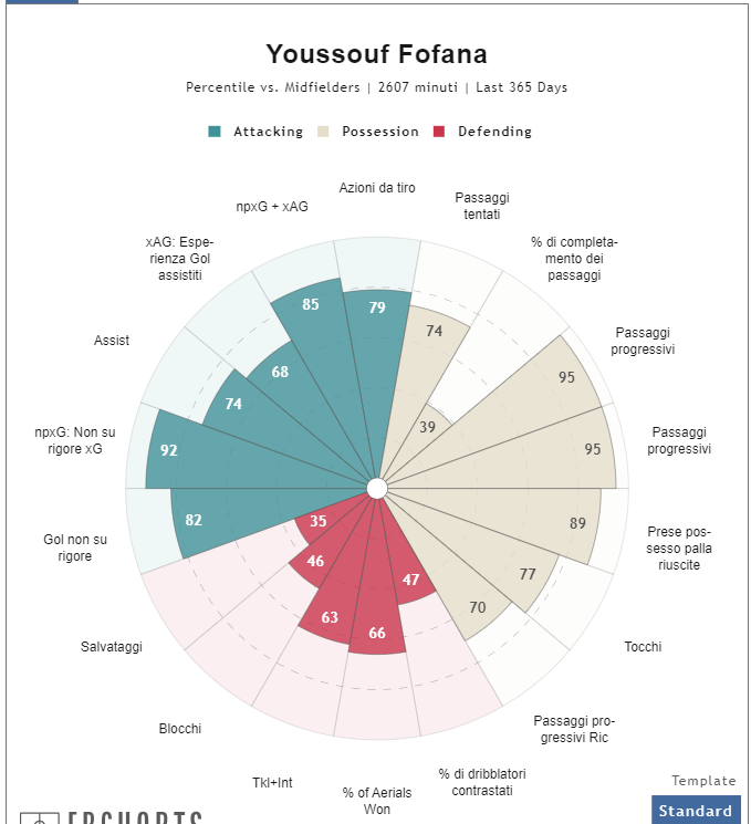 Il titolo forse può sembrare esagerato, ma racchiude quello che è Youssouf Fofana. Praticamente ovunque si legge delle sue buone doti in fase di interdizione, ma Fofana è molto più che un semplice interditore. Iniziamo da una panoramica dei dati che lo riguardano.