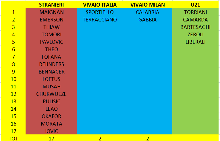 In Champions non parliamo di u23 ma di u21 con almeno 2 stagioni nel club per poter essere considerati in lista B. Ad esempio Jimenez è un solo anno al Milan quindi per giocare dovrebbe andare in lista con i 17 stranieri. Terracciano idem deve andare in lista, ma può essere serenamente inserito nel vivaio italiano. E’ chiaro che dovendo inserire Musah in lista A con gli stranieri (cosa evitabile in lista Serie A essendo 2002), c’è un esubero tra gli stranieri. La cosa più logica avendo Terracciano in lista da italiano e Bartesaghi in lista B, oltre al reparto ali con 2 per ruolo, che a far posto a Musah sia Saelemaekers che resterebbe fuori dalla lista Champions.