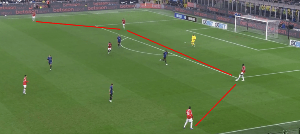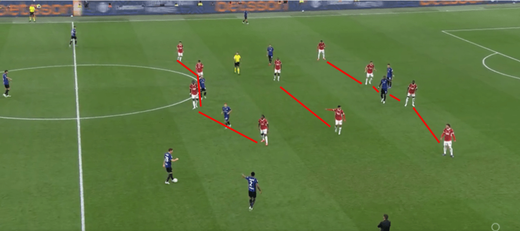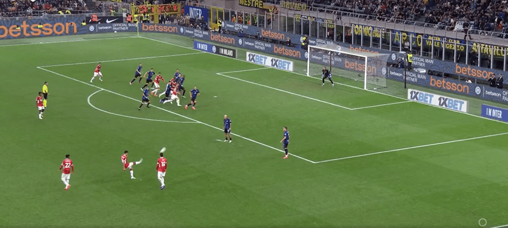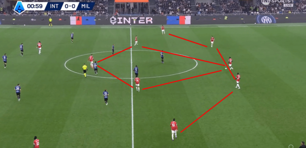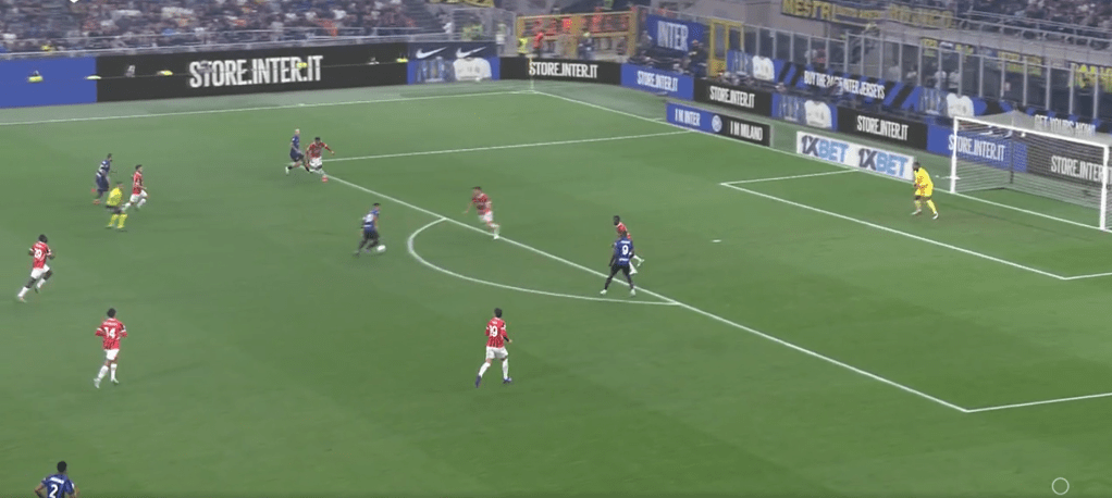 In fase difensiva invece abbiamo visto un Milan molto corto (circa 20 metri) col suo classico 424. Pressava su rimessa dal fondo, ma in linea di massima ha sempre tenuto una linea di pressione abbastanza bassa, consentendo all’Inter di palleggiare con i difensori, ma senza trovare sbocchi tra le linee. A differenza del Milan di Pioli che andava più a uomo, con Fonseca si è lavorato a zona e questo ha cambiato parecchio il risultato finale. Proprio per una questione di caratteristiche, una squadra che fa un calcio relazionale con tanta fluidità (e l’Inter è una delle migliori interpreti in questo), è difficile da limitare per chi va uomo su uomo. L’Atalanta è l’esempio pratico di come negli ultimi anni abbia sofferto tantissimo contro l’Inter, proprio perché lavora uomo-uomo a tutto campo e contro un calcio relazionale con uno sviluppo fluido e ben allenato, chi va a uomo soffre oltremodo. Il Milan di Pioli aveva principi un po’ diversi, ma sempre andava a uomo creando coppie a centrocampo. Con Fonseca cambia il modo di difendere e questo ha lasciato spazi (volontariamente) all’Inter solo sulle fasce, proteggendo il centro e senza mai andare a pressarli.