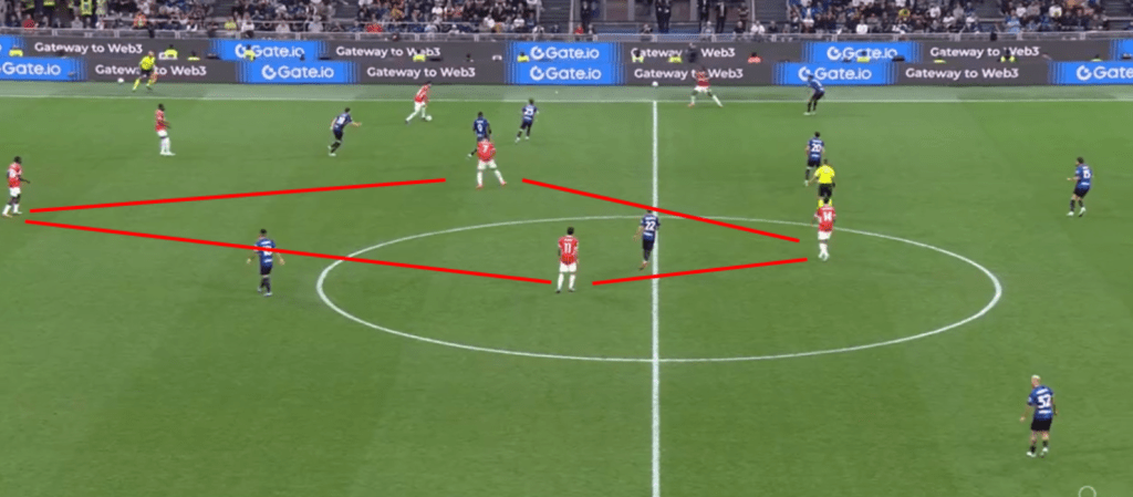 Come dicevamo in precedenza, rispetto a inizio campionato, stiamo vedendo ultimamente il Milan costruire con i 4 difensori e abbassando Fofana da mediano, mentre a inizio anno stavamo vedendo spesso una costruzione 3+2. La crescita di condizione di Fofana abbinata alle sue qualità elevatissime di interdizione, fanno aumentare nettamente la solidità del Milan, anche se Fofana non è solo un interditore, ma è un centrocampista totale come avevamo visto nell’analisi quando è stato acquistato. Ha qualità per toccare la palla di prima, per non perderla sotto pressione e farla progredire in verticale.